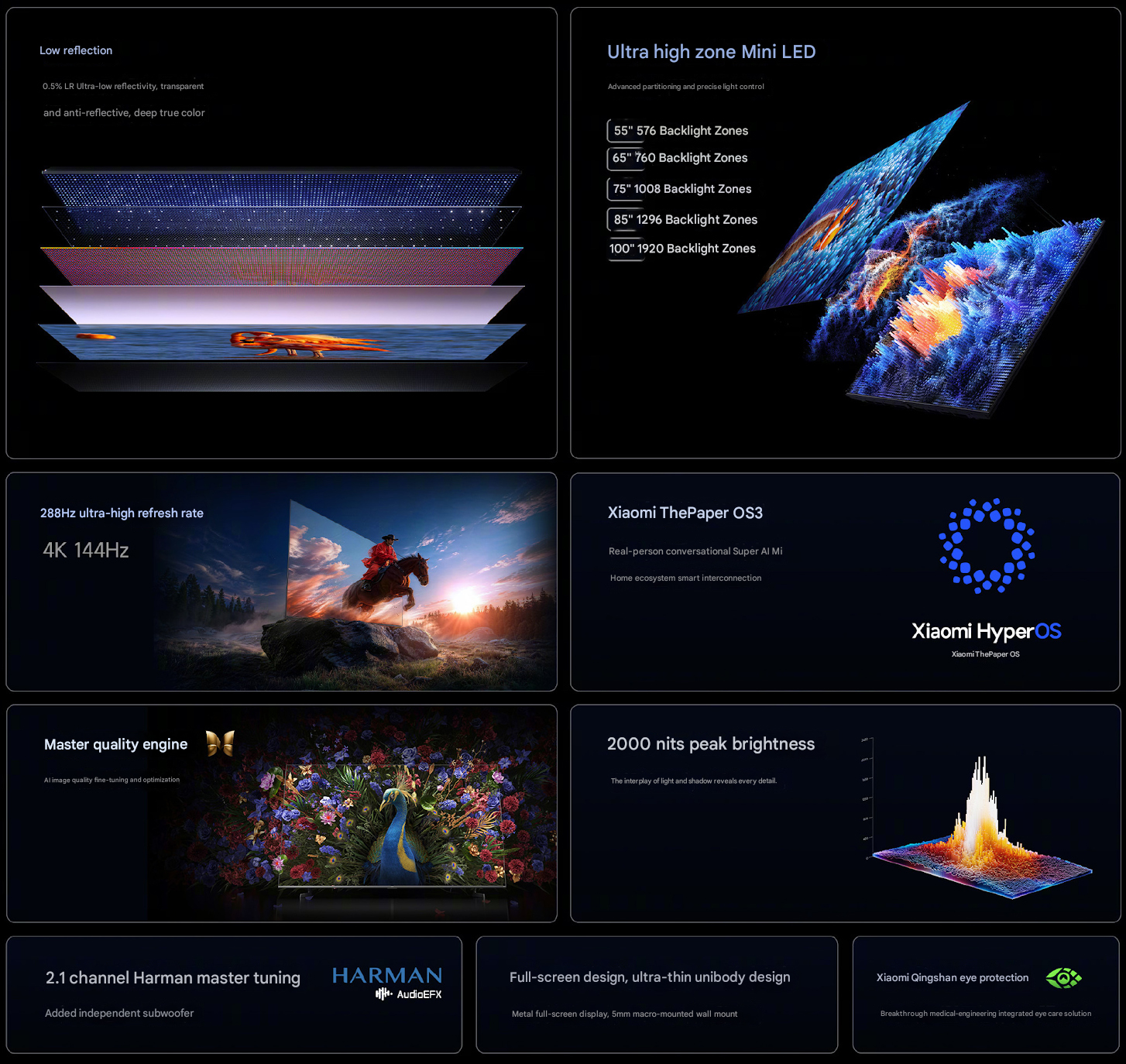 Ulepszona linia telewizorów Xiaomi S Mini LED obiecuje również płynne wrażenia w grach z częstotliwością odświeżania do 288 Hz, a dzięki powłoce o niskim współczynniku odbicia, wyświetlacze mają na celu zapewnienie komfortowego oglądania w różnych warunkach oświetleniowych. W dziale audio znajduje się 2.1-kanałowy system dźwiękowy z tuningiem Harman AudioEFX. Proszę sprawdzić naszą poprzednią relację aby dowiedzieć się więcej o tej serii.