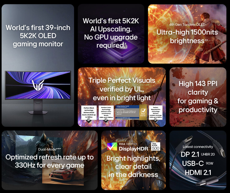Podsumowując, LG potwierdziło już, że UltraGear OLED 39GX950B będzie wyświetlać obraz w rozdzielczości 5 120 x 2 160 (5K2K) z częstotliwością odświeżania 165 Hz. Według kanadyjskiej strony internetowej firmy, monitor może przeskalować zawartość do 5K2K bez wejścia z urządzenia podłączonego przez porty DisplayPort 2.1, HDMI 2.1 i USB Type-C. Alternatywnie, monitor może podwoić częstotliwość odświeżania, zmniejszając rozdzielczość do 1080p (2560 x 1080). Dodatkowo, zakrzywiony monitor 1500R zapewnia jasność szczytową 335 nitów SDR i 1500 nitów HDR (APL 1,5%) przy 99% pokryciu przestrzeni barw DCI-P3.