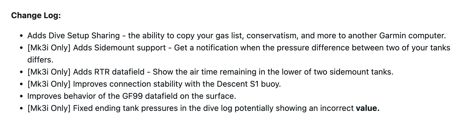 W wersji 25.21 smartwatche Garmin Descent Mk3 i Mk3i zyskały nową funkcję udostępniania ustawień nurkowania. Umożliwia ona użytkownikom kopiowanie informacji, takich jak lista gazu i konserwatyzm, do innego urządzenia Garmin. Oba gadżety odnotowują również poprawę danych Gradient Factor 99% (GF99) wyświetlanych na powierzchni.