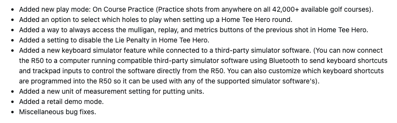 Wraz z wersją oprogramowania 4.80, użytkownicy Approach R50 zyskują szereg nowych funkcji. Dostępny jest nowy tryb gry, On Course Practice, który pozwala wypróbować różne uderzenia na ponad 42 000 pól golfowych. Użytkownicy mogą teraz wybrać dołek do gry podczas rundy Home Tee Hero, a w tym trybie można wyłączyć karę Lie Penalty. Ponadto użytkownicy mogą teraz uzyskać dostęp do przycisków mulligan, powtórki i metryki poprzedniego strzału w Home Tee Hero.