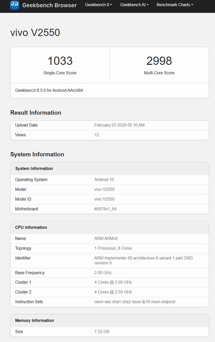 Jak pokazuje poniższa grafika, urządzenie, o którym mowa, to Vivo V70 FE. Podobnie jak Galaxy S25 FE (obecnie 449 USD na Amazon), mówi się, że V70 FE przyjmuje wolniejszy chipset niż jego rodzeństwo, aby osiągnąć status "Fan Edition". W szczególności twierdzi się, że Vivo wyposażyło V70 FE w Dimensity 7360 Turbo, chipset 4 nm, który MediaTek opiera się na czterech rdzeniach Cortex-A78 i czterech rdzeniach Cortex-A55.