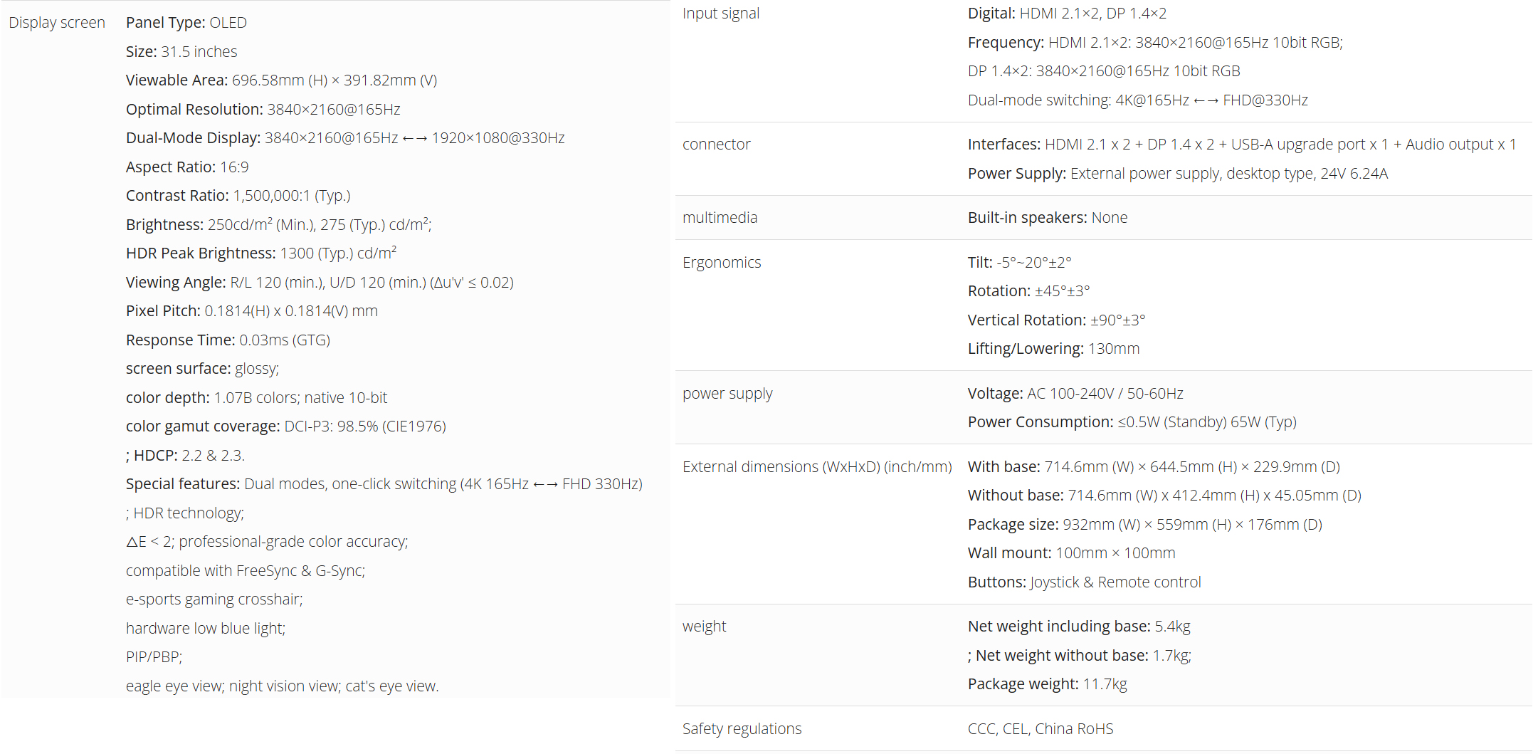 Podczas gdy nowszy monitor do gier zachowuje panel OLED z dwoma trybami, może zaoferować częstotliwość odświeżania 330 Hz w trybie rozdzielczości 1080p i częstotliwość odświeżania 165 Hz w 4K. Dla porównania, xG323-4K-OLED2 który został wprowadzony na rynek w zeszłym roku, może osiągnąć 480 Hz w trybie FHD i 240 Hz w 4K.