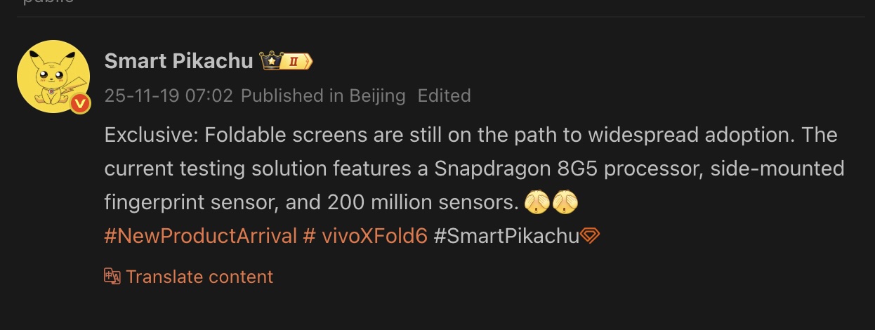 Pisząc na Weibotipster Smart Pikachu sugeruje, że Vivo X Fold 6 będzie zasilany przez Qualcomm Snapdragon 8 Gen 5. Jest to nowy sub-flagowy procesor, który zadebiutuje jeszcze w tym miesiącu wraz z OnePlus Ace 6T. Niedawny test procesora Test procesora Geekbench 6 ujawnił wyniki 2,981 w trybie jednordzeniowym i 10,136 w trybie wielordzeniowym, co sugeruje znaczną poprawę wydajności w porównaniu z Vivo X Fold 5's Snapdragon 8 Gen 3 chipsetu.