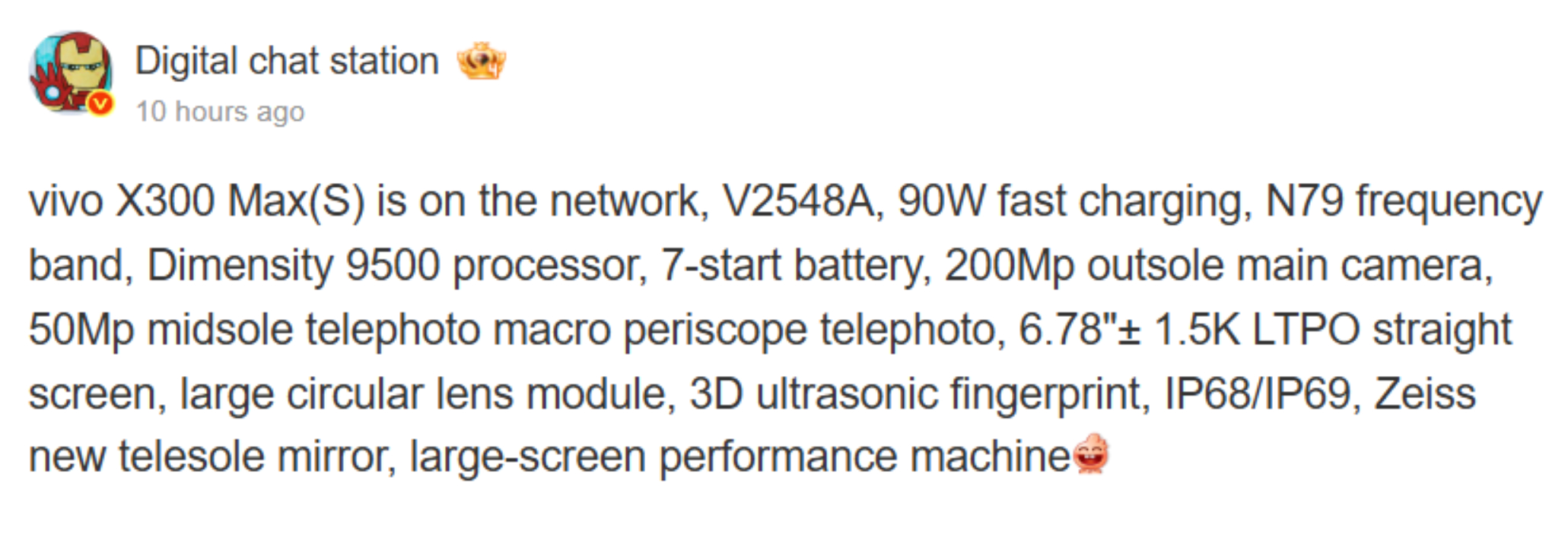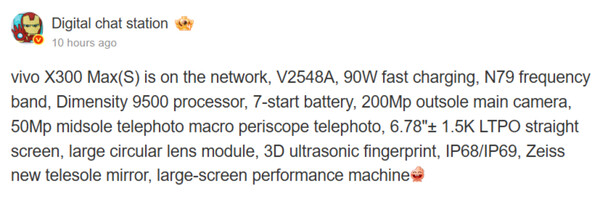 Zamiast tego, leakster koncentruje się na X300 Max, który według 3C obsługuje szybkie ładowanie 90 W, podobnie jak wcześniejsze X300 i X300 Pro. Dodatkowo, Digital Chat Station twierdzi, że Vivo uzupełniło tę możliwość ładowania baterią o pojemności około 7000 mAh i procesorem MediaTek Dimensity 9500 chipset. Inne zalety to wyświetlacz LTPO OLED o przekątnej 6,78 cala i rozdzielczości 1440p, optyka Zeiss i certyfikat IP. Data premiery pozostaje jednak na razie niejasna.