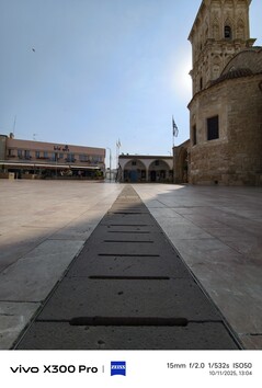 Kościół św. Łazarza w Larnace posłużył jako obiekt referencyjny dla pierwszego ultraszerokokątnego porównania modeli Vivo. Proszę wybaczyć nieco inne kąty fotografowania w każdym przypadku, ale niezależnie od tego, zwycięzca powinien być dość jasny. Vivo X200 Ultra nie tylko oferuje najszersze pole widzenia i jest jedynym modelem zdolnym do uchwycenia kościoła w całości, ale jego renderowanie bardziej odległych szczegółów jest również wyraźnie najostrzejsze. Nawet w świetle dziennym jest więc wyraźnym zwycięzcą przy powiększeniu 300×, chociaż Vivo X300 Pro jest nadal zauważalnie lepszy niż Vivo X100 Pro.