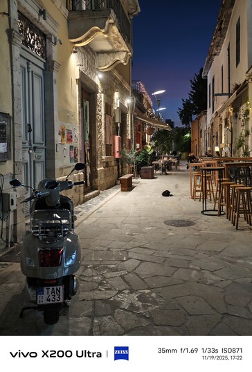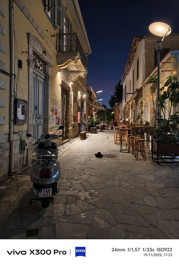 Na pierwszy rzut oka wyróżniają się prześwietlone lampy w Galaxy S23 Ultra, podczas gdy trzy modele Vivo znacznie lepiej kontrolują światła. Vivo X200 Ultra pokazuje najwięcej szczegółów w odległych obiektach, co nie jest zaskakujące, biorąc pod uwagę ogniskową 35 mm. Z perspektywy czasu wynik ten potwierdza odejście Vivo od IMX989: pomimo mniejszych czujników, Vivo X100 Pro nie jest w stanie nadążyć, nawet z bliskiej odległości. Na przykład, po lewej stronie motocykla, Vivo X300 Pro pokazuje więcej szczegółów niż zarówno X100 Pro, jak i X200 Ultra.