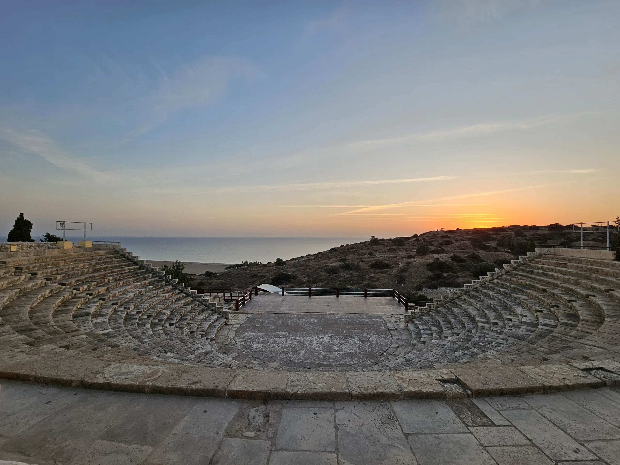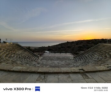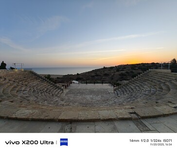 W przypadku drugiego przykładu ultraszerokokątnego, przenosimy się 81 kilometrów dalej do Curium (Kourion), starożytnego stanowiska archeologicznego ze wspaniałym widokiem na okolicę. W listopadzie zwykle niewiele się tu dzieje, więc niektóre części tego miejsca mogą wydawać się prawie opuszczone, takie jak amfiteatr o zachodzie słońca. To porównanie obejmuje również telefon Samsung z 2023 roku w linii ultraszerokokątnej, pokazany w prawym dolnym rogu na każdym zdjęciu.