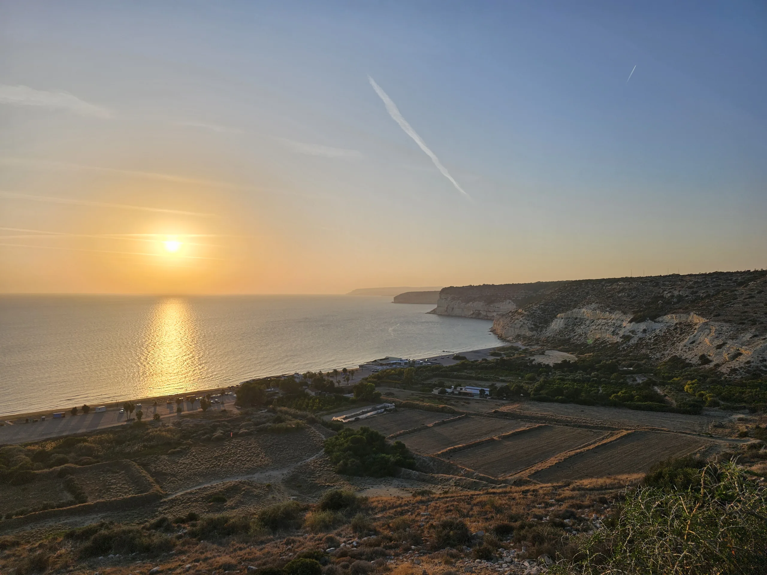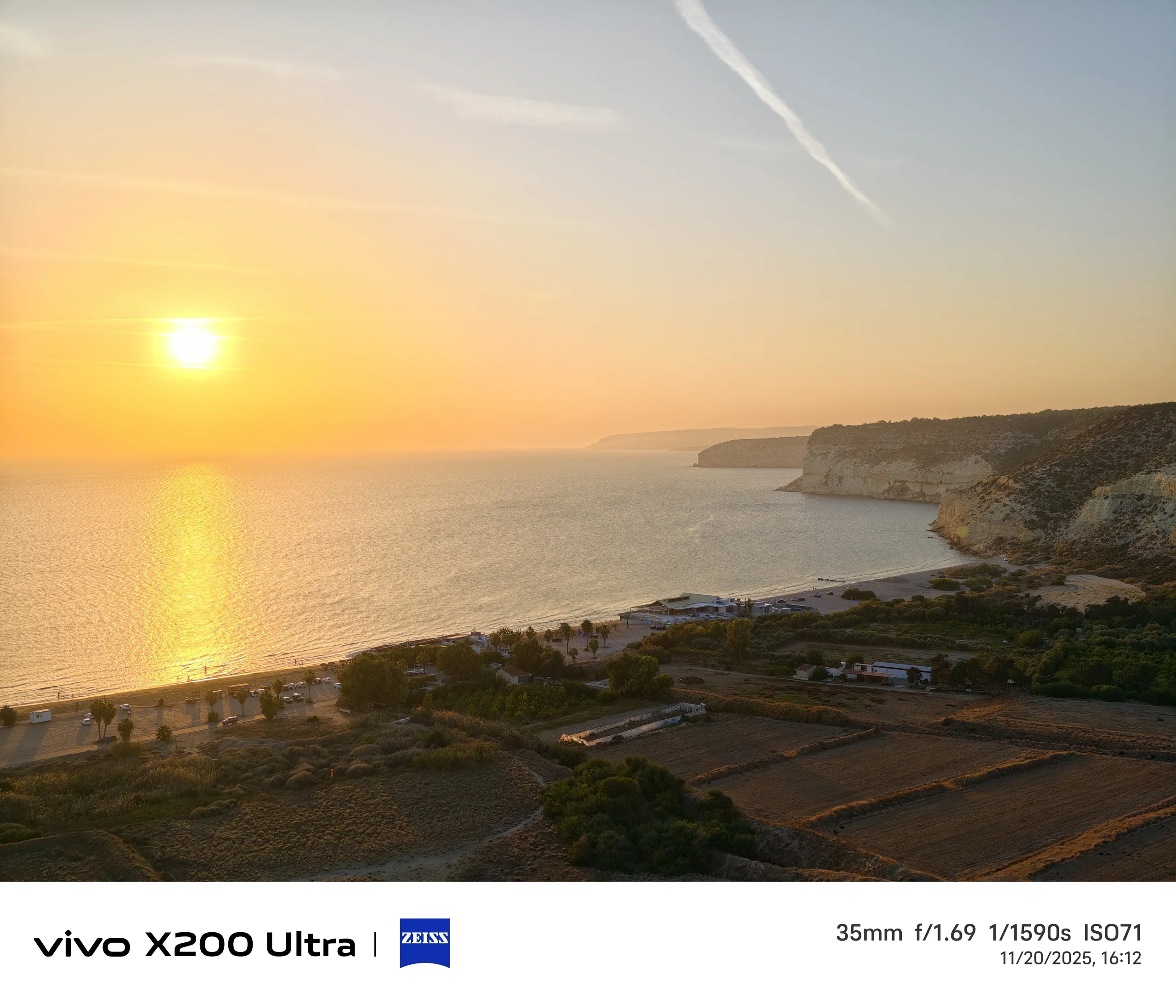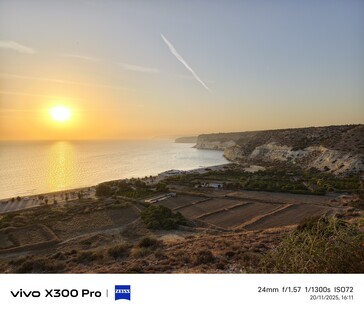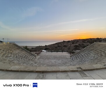 W drugim przykładzie wracamy do Kourion, patrząc w kierunku zachodzącego słońca i plaży Kourion. 1-calowy sensor Vivo X100 Pro zapewnia najbardziej kolorowe odwzorowanie zachodu słońca, ale niekoniecznie najdokładniejsze, ponieważ słońce nie było wtedy tak czerwone. Pomimo posiadania największego sensora i najdłuższego czasu otwarcia migawki, zdjęcie to jest również najciemniejsze.