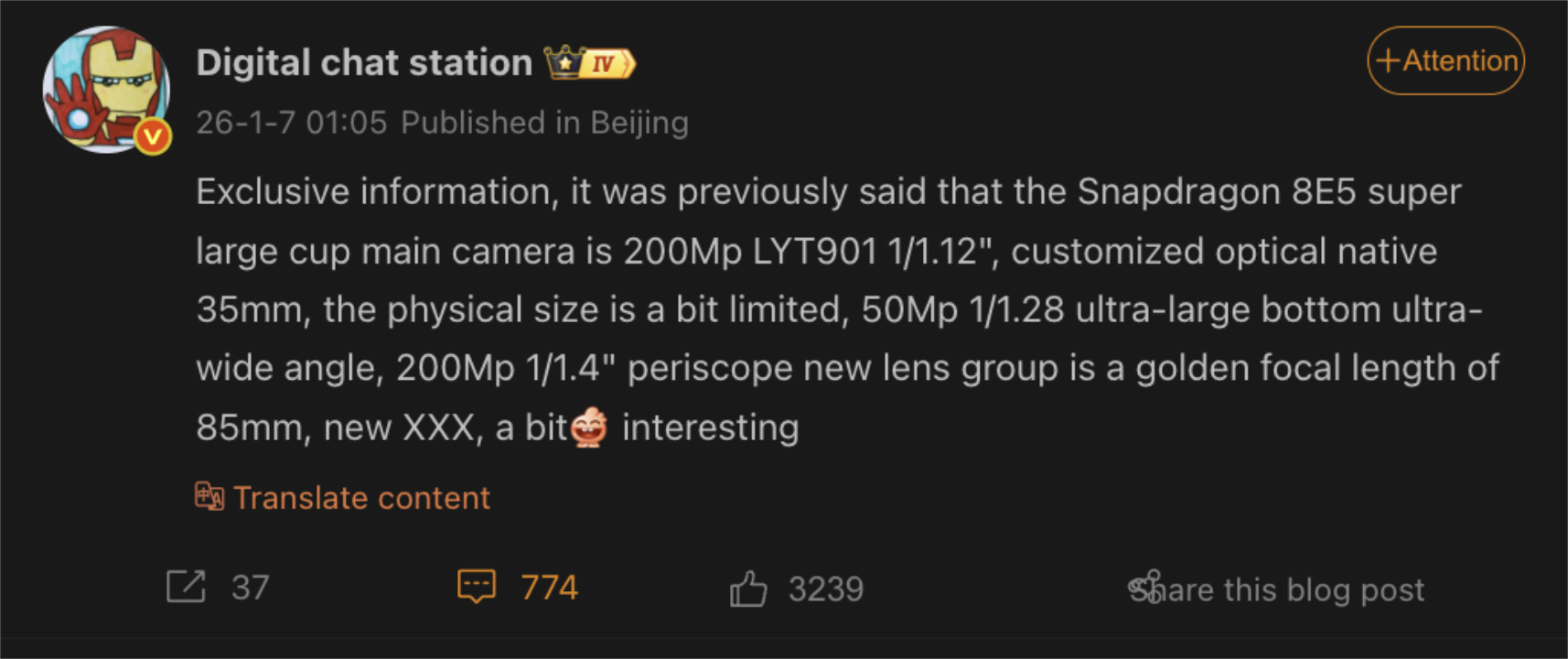 Pisząc na Weibo, ten sam przeciek powtarza, że X300 Ultra dołączy do Galaxy S26 Ultra i OnePlus 15 w przyjmowaniu Qualcomm's Snapdragon 8 Elite Gen 5 platformy. Dodatkowo piszą, że planowany jest następujący sprzęt fotograficzny: