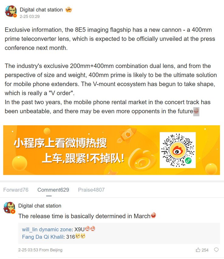 Dodatkowo, Digital Chat Station zasugerowało, że do Vivo X300 Ultra dołączy również nowe akcesorium telekonwertera, które przyjmuje dwie równoważne ogniskowe. Pisząc na Weibo, przeciek zapewnia, że akcesorium będzie obsługiwać tryby 200 mm i 400 mm, aby uzupełnić oczekiwany teleobiektyw 85 mm zawarty w X300 Ultra.