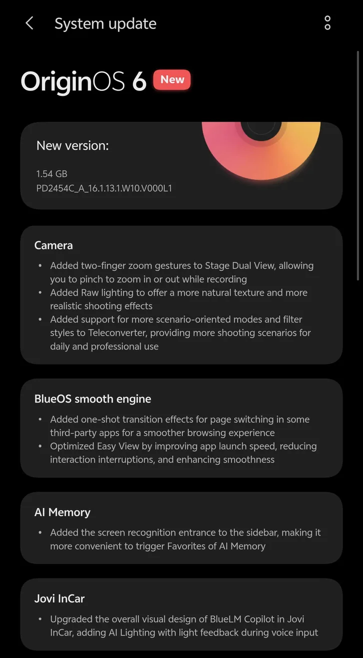 Jak pokazuje poniższy zrzut ekranu, nowa aktualizacja to 1,54 GB do pobrania z ponad pół tuzinem nadrzędnych zmian. Spośród siedmiu pokazanych, trzy są poświęcone ulepszeniom aparatu. Prawdopodobnie największą zmianą jest dodanie oświetlenia Raw. Wcześniej dostępne tylko w X300 Prooświetlenie Raw ma na celu stworzenie bardziej realistycznie wyglądającego obrazu poprzez zminimalizowanie efektów AI i HDR.