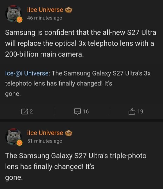 Co ciekawe, dzieje się to dzień po tym, jak Ice Universe opublikował render Galaxy S27 Ultra, prosząc o opinie społeczności na temat projektu. Render miał również trzy kamery z tyłu. To pozwala nam sądzić, że render Ice Universe Galaxy Render S27 Ultra może być czymś więcej niż tylko obrazem stworzonym przez fanów.