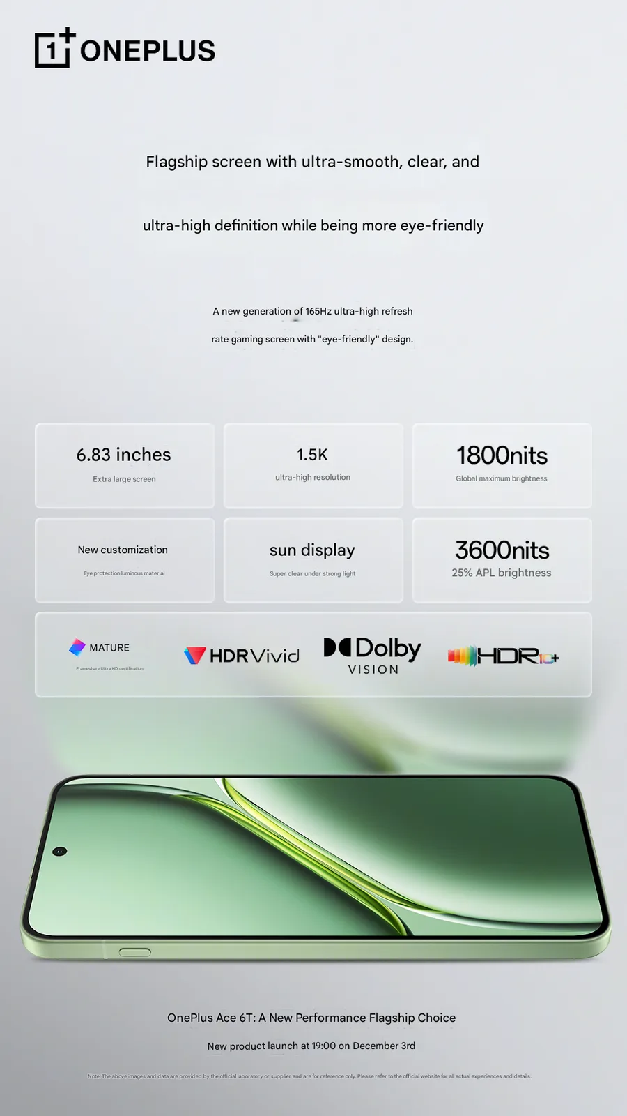 Oprócz udostępnienia tych informacji na globalnej stronie, OnePlus szczegółowo opisał wyświetlacz Ace 6T za pośrednictwem swojego chińskiego konta Weibo. Poprzez niedawny zwiastun marka ujawnia, że 6,83-calowy ekran 165 Hz będzie miał "globalną maksymalną jasność" 1800 nitów, wsparcie dla HDR10 + i będzie wyposażony w Dolby Vision.