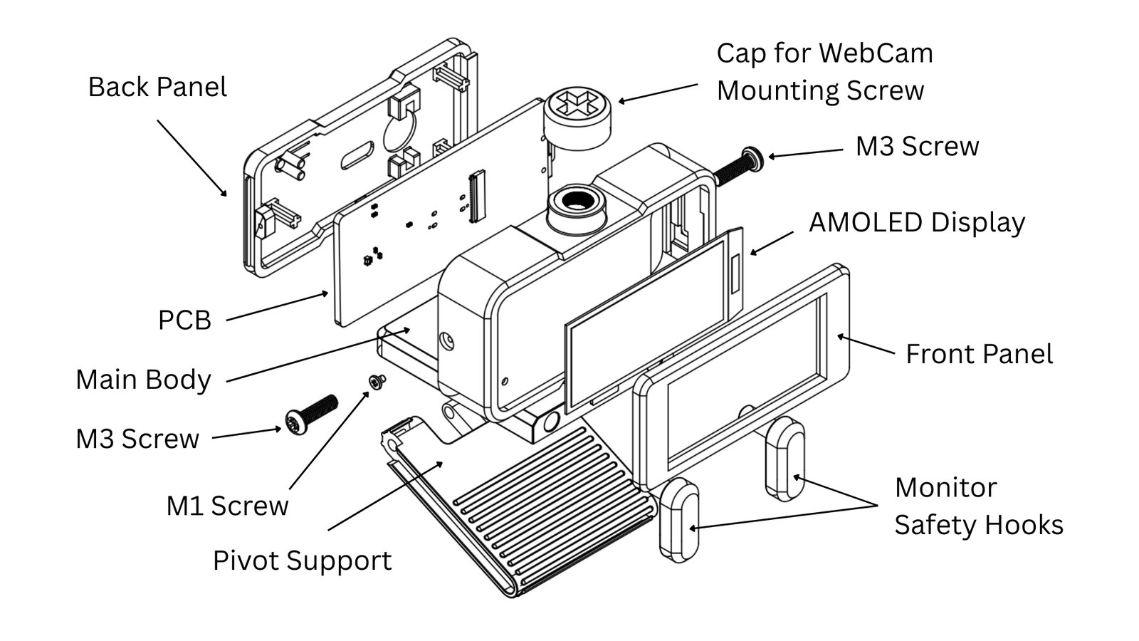 Urządzenie mierzy 68 x 60 x 54 mm i waży około 100 gramów. Jest zasilane i podłączane przez USB-C, z konstrukcją montażową na górze monitora, która umożliwia układanie kamer internetowych. Wszystkie komponenty sprzętowe i programowe są typu open source i udostępniane na liberalnych licencjach, aby ułatwić wkład społeczności. Dedykowane Serial IDE umożliwia kodowanie i debugowanie JavaScript na żywo bez konieczności wyjmowania karty microSD.