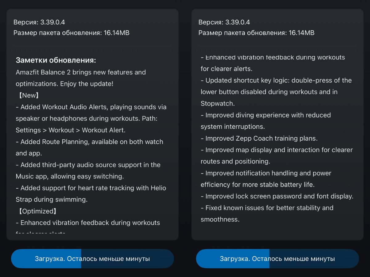 Oprogramowanie układowe w wersji 3.39.0.4 wprowadza również kilka ulepszeń dla użytkowników Amazfit Balance 2. Obejmują one optymalizacje wibracji podczas ćwiczeń, zakłócenia systemu podczas nurkowania i doświadczenie planu treningowego Zepp Coach. Istnieją również ulepszenia wyświetlania mapy z dodatkowymi informacjami o trasie, a żywotność baterii ma być bardziej stabilna. Pełny rejestr zmian znajdą Państwo na poniższym obrazku.