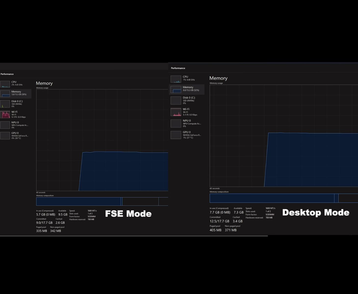 Godnym uwagi aspektem FSE jest jego zdolność do zawieszania standardowego środowiska pulpitu systemu Windows, redukując procesy działające w tle i obniżając ogólne zużycie pamięci. W testach pokazanych przez YouTubera, laptop do gier wyposażony w kartę graficzną Nvidia GeForce RTX 5050 zużywał około 5,7 GB pamięci RAM w trybie FSE w porównaniu do 7,7 GB w zwykłym trybie pulpitu, co jest zgodne z twierdzeniem Twierdzeniem Microsoftu o zaoszczędzeniu około 2 GB. Redukcja ta może przynieść znaczne korzyści systemom z ograniczoną pamięcią lub zintegrowanymi konfiguracjami graficznymi, które polegają na współdzielonej pamięci RAM.