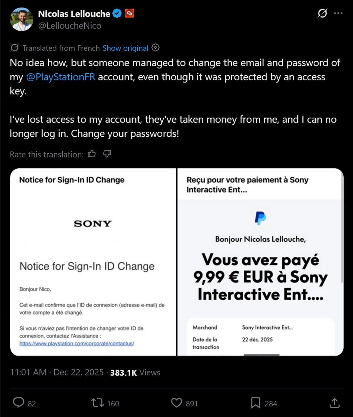 Pisarz dla Numerama, Nicolas Lelloucheudokumentował swoje zmagania w mediach społecznościowych. Najpierw opisał, jak haker włamał się na jego Konto PSN i zastąpił powiązany z nim adres e-mail i hasło. Lellouche zauważył również opłatę w wysokości 9,99 euro, która jest opłatą za zmiany.