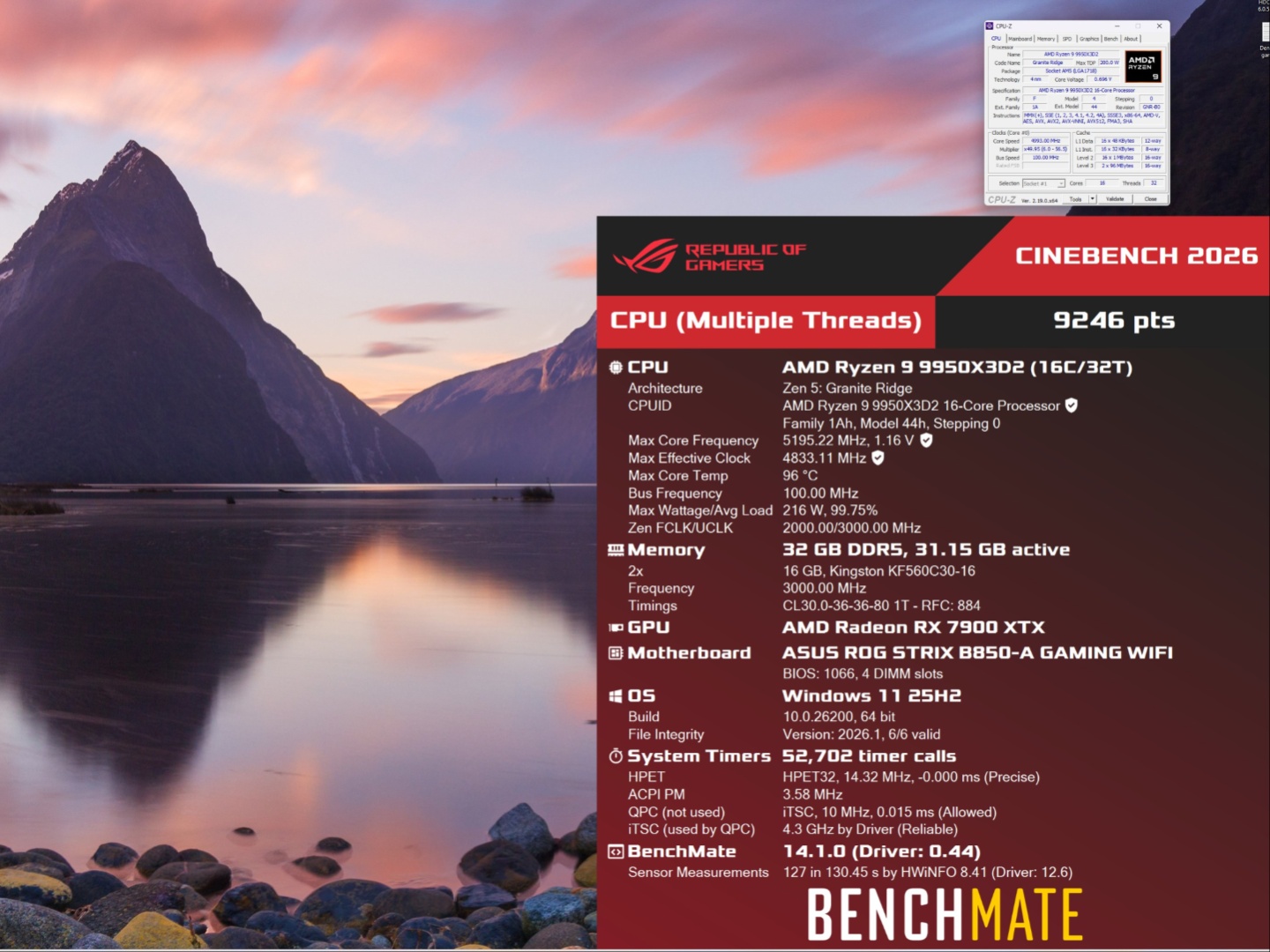 Zaczynając od 7-Zip, 9950X3D2 odnotował 227 919 MIPS z procesorem osiągającym 5,13 GHz i 96 stopni C. Wynik Cinebench 2026 single-core wyniósł 746 punktów przy taktowaniu 5,4 GHz i temperaturze 76 stopni Celsjusza. Wynik wielordzeniowy https://hwbot.org/benchmarks/cinebench_-_2026_multiple_threads/submissions/6005559 wyniósł 9 246 punktów przy temperaturze 96 stopni C i maksymalnym taktowaniu 5,19 GHz. Wreszcie, wynik Cinebench R23 Multi Core wyniósł 38 579 punktów przy 95 stopniach C i maksymalnym taktowaniu 5,19 GHz. Pod względem poboru mocy, Ryzen 9 9950X3D2 osiągnął maksymalnie 220W w teście Cinebench R23. Okno CPU-Z pokazuje 200 W TDP dla procesora, co jest zgodne z oceną AMD.