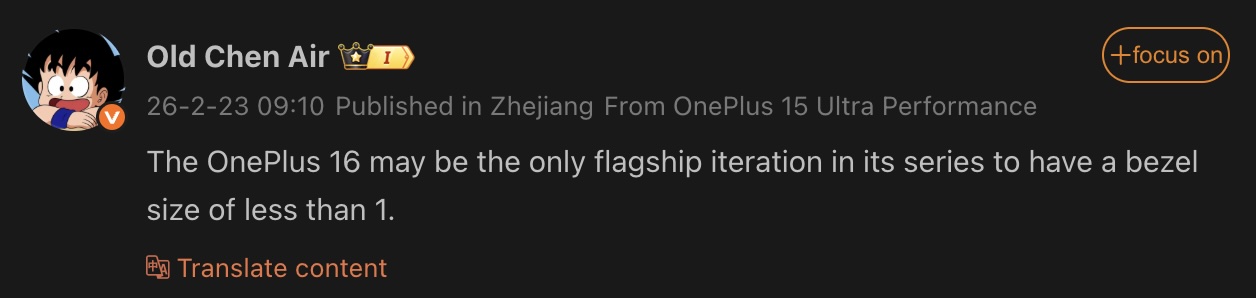 Nowy przeciek od tipstera Old Chen Air pojawił się teraz w chińskim serwisie społecznościowym Weiboujawniając kluczową atrakcję wyświetlacza OnePlus 16. Według przecieku, OnePlus 16 może mieć ramki mierzące poniżej 1 mm. Dla kontekstu, ramki wyświetlacza OnePlus 15 mierzyły 1,15 mm.