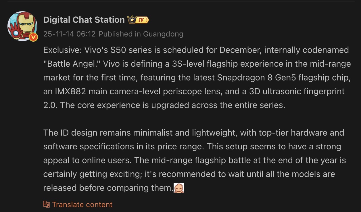 Nie jest jasne, czy seria S50 będzie również zawierała dwa modele, jak jej poprzednik. Tipster Digital Chat Station zasugerował wcześniej, że seria będzie zawierała kompaktowy model, prawdopodobnie oznaczony jako S50 Pro Mini. W nowym przecieku https://weibo.com/6048569942/QdLymnukp?pagetype=profilefeedtipster twierdzi, że seria Vivo S50 będzie wykorzystywać nowy procesor Qualcomm Snapdragon 8 Gen 5 procesor. Jest to sub-flagowy chipset firmy Qualcomm, umieszczony poniżej Snapdragon 8 Elite Gen 5. Dla porównania, standardowy S30 wykorzystywał Snapdragon 7 Gen 4 a S30 Pro Mini korzystał z Dimensity 9300 Plus.