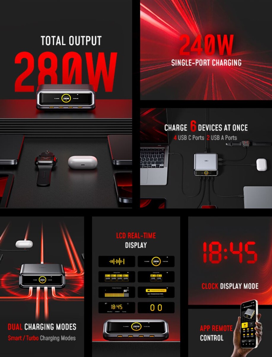 AOHi 280W GaN+ Desktop Charger to stacjonarna stacja ładująca, która może zasilać różne urządzenia. Wizualnie mocno przypomina dobrze znane alternatywy od Anker i EcoFlow. Z mocą wyjściową do 280 W, ten nowy model plasuje się dokładnie pomiędzy nimi. Zasilanie jest dostarczane za pośrednictwem sześciu portów, w szczególności czterech portów USB-C i dwóch portów USB-A. Do 240 W może być dostarczane przez pojedynczy port USB-C, umożliwiając bardzo szybkie ładowanie nawet potężnych urządzeń, takich jak notebooki itp.