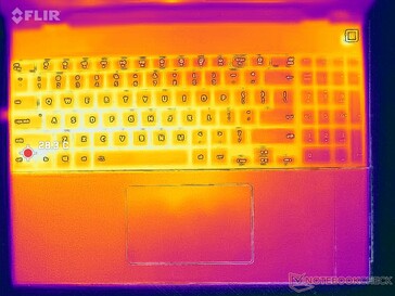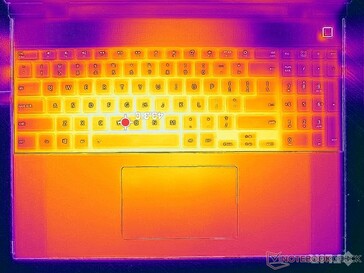 Ze względu na metalową obudowę i ospałe wentylatory temperatury powierzchni są zawsze wysokie. Podczas uruchamiania bardziej wymagających obciążeń, takich jak gry, gorące punkty mogą osiągnąć ponad 40 C na górnej i dolnej stronie podstawy laptopa. Gorące punkty znajdują się bliżej środka Laptopa 16, podczas gdy w większości innych laptopów są one zazwyczaj skierowane do tyłu. Oznacza to, że istnieje większe prawdopodobieństwo zauważenia nagrzewania się systemu Framework podczas użytkowania w porównaniu do czegoś takiego jak HP Spectre x360 16 gdzie podpórki pod nadgarstki i przednie obszary są zwykle chłodniejsze. Mimo to, nigdy nie stwierdziliśmy, by Laptop 16 był niekomfortowo ciepły na skórze.