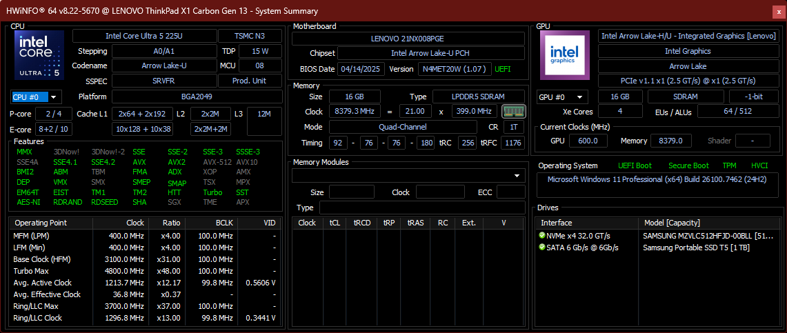 | Lenovo ThinkPad X1 Carbon Gen 13 21NX008PGE Intel Core Ultra 5 225U ⎘ Intel Graphics 4-Core iGPU (Arrow Lake) ⎘ 16 GB Pamięć, 512 GB SSD | Amazon: $1,649.99 Cena katalogowa: 1955 Euro | 1.2 kg | 17.5 mm | 14.00" 1920x1200 162 PPI IPS LED | |