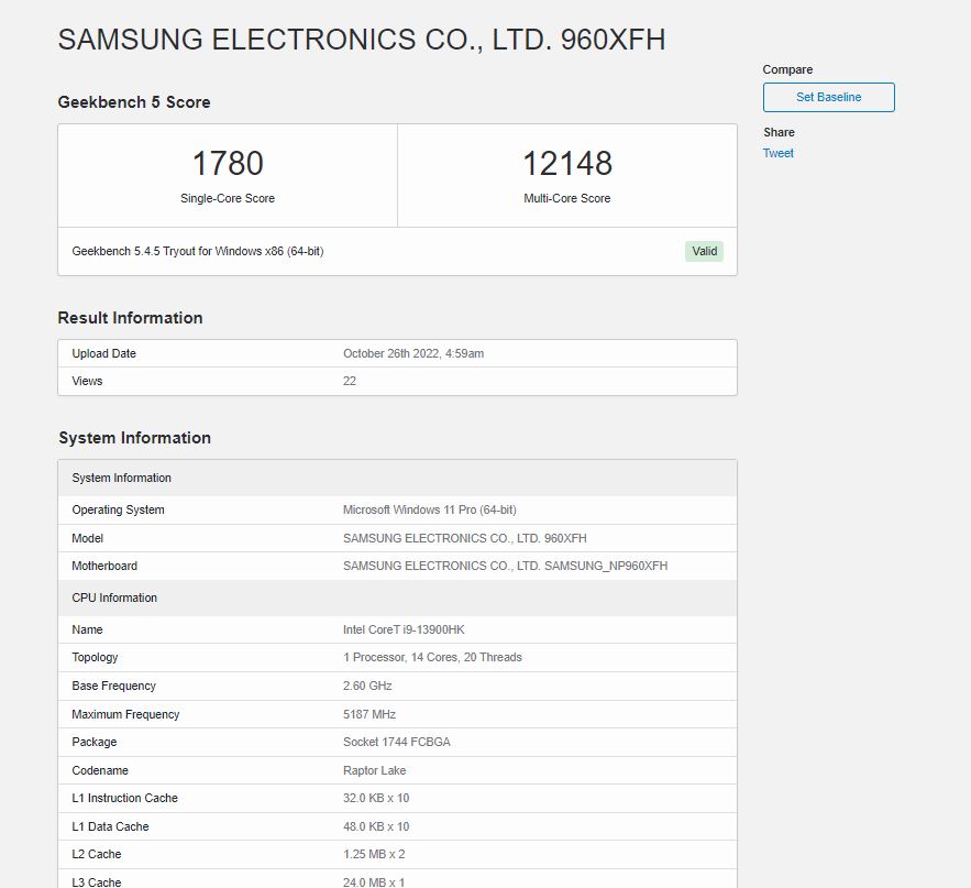 Core i9-13900HK złożył teraz kolejną wizytę w Geekbench czego efektem są prawidłowe wyniki benchmarku jedno- i wielordzeniowego, które wynoszą odpowiednio 1,780 i 12,148 punktów. Informacja dociera do nas dzięki uprzejmości BenchLeaks. Co ciekawe, procesor umieszczono w tej samej maszynie Samsung 960XFH, co w poprzedniej odsłonie układu, ale częstotliwość taktowania wzrosła o prawie 1100 MHz i wynosi mniej więcej 5,2 GHz.