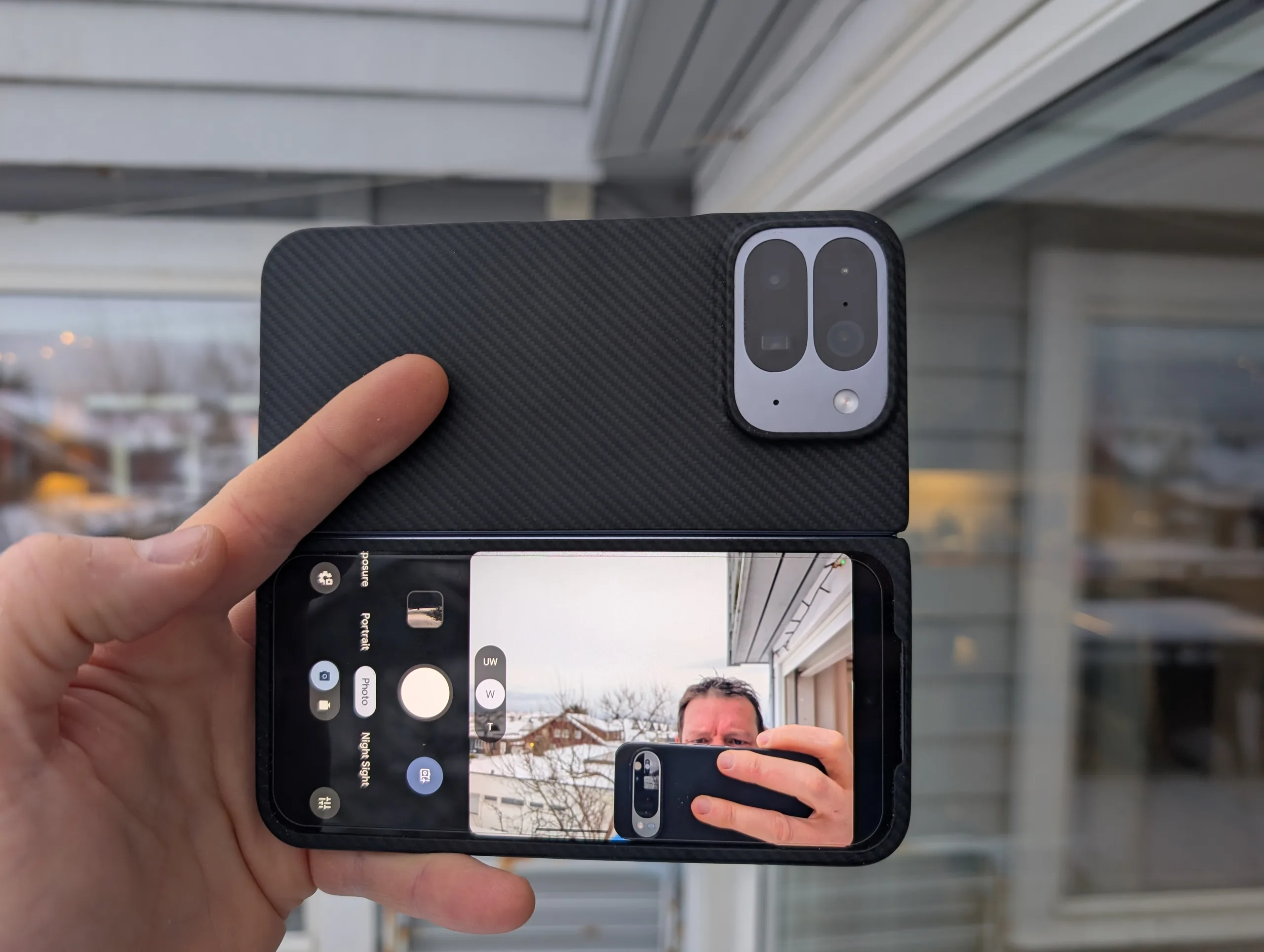 To powiedziawszy, jednym z największych punktów sprzedaży była dla mnie możliwość wykorzystania tylnych kamer jako aparatów do selfie, gdy urządzenie było rozłożone. Ponownie, coś, co na papierze może być bardzo atrakcyjne, ale w rzeczywistości jest prawie całkowicie niepraktyczne. Kilka tygodni zajęło mi wypracowanie chwytu, który nazywam "diabelskimi rogami". Jedyny praktyczny sposób na jednoczesne trzymanie telefonu i robienie selfie, co nieco zmniejsza ryzyko upuszczenia inwestycji o wartości 1800 USD.