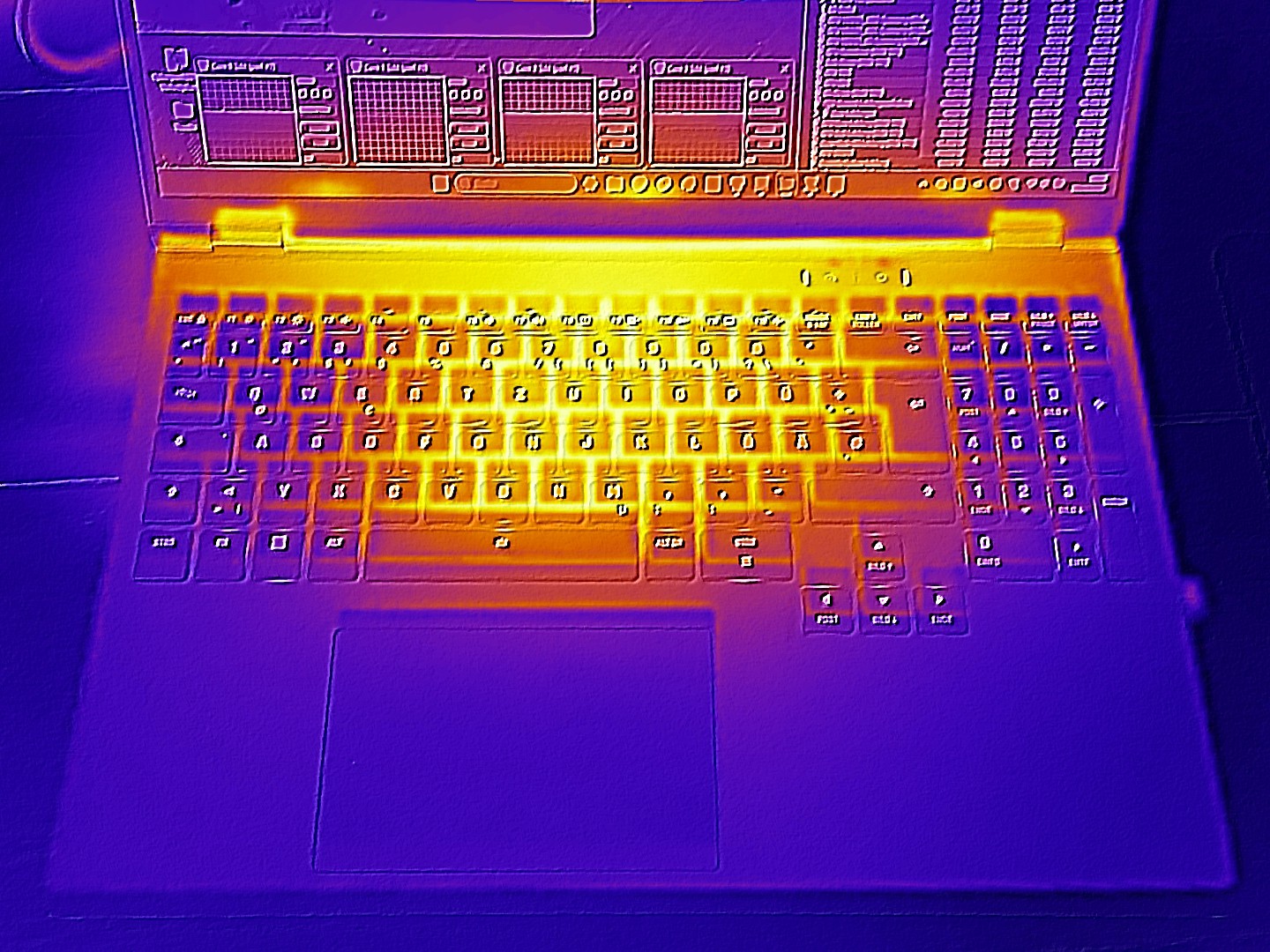 Pod obciążeniem spód obudowy nagrzewa się bardziej, osiągając maksymalnie 57 °C, podczas gdy góra osiąga 46 °C. W trybie bezczynności, obudowa osiąga umiarkowaną temperaturę od 25 do 31 °C.