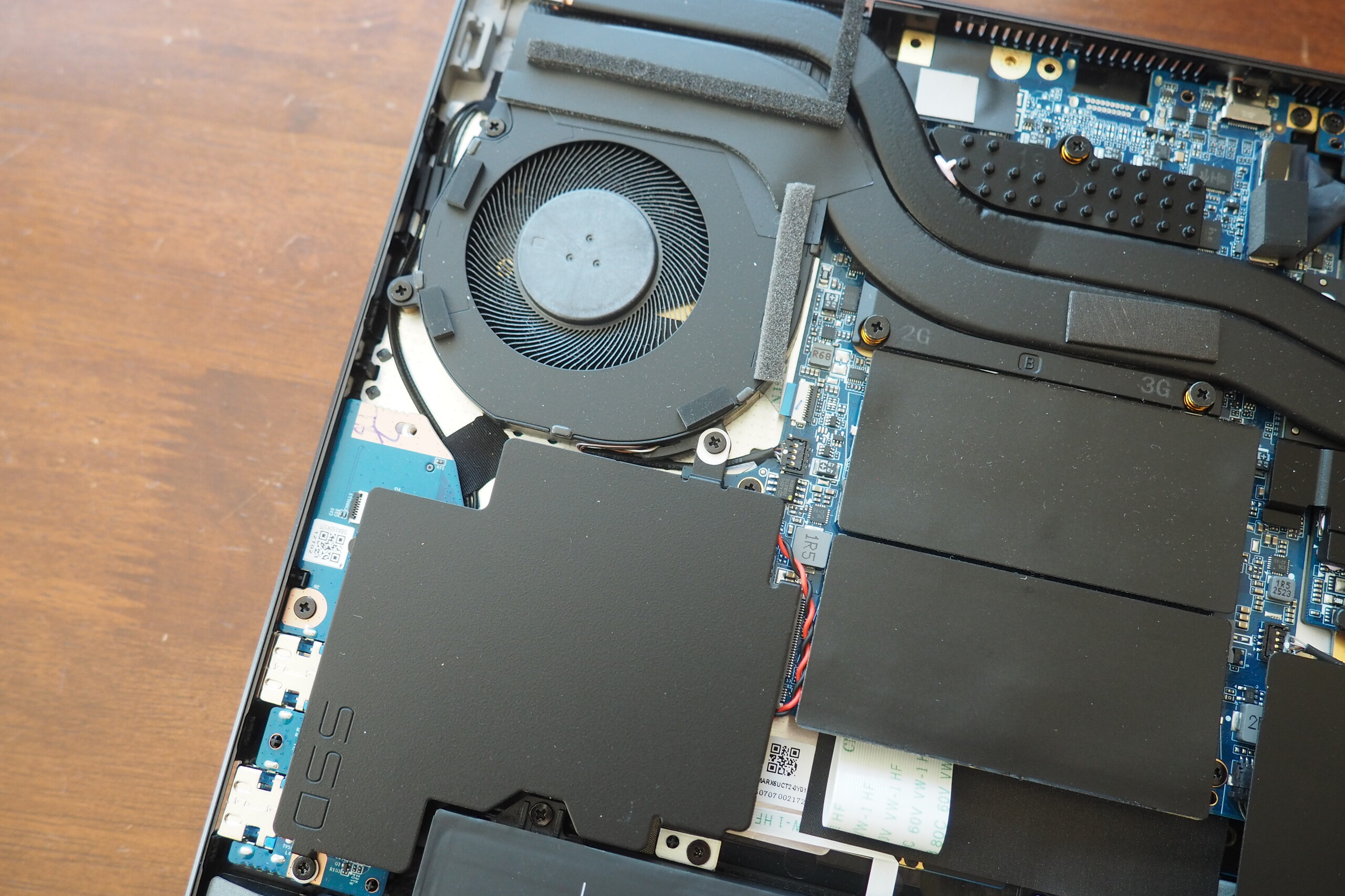 Moduł Wi-Fi MediaTek zapewnia przyzwoite prędkości wysyłania i bardzo dobre prędkości pobierania. Następna jest kamera internetowa FHD, która zapewnia dość ostry obraz jak na standardy laptopów i zawiera fizyczną migawkę prywatności. Dostęp do podzespołów wewnętrznych jest łatwy po odkręceniu 10 śrub z łbem krzyżakowym; zdjęcia podzespołów wewnętrznych można znaleźć poniżej.