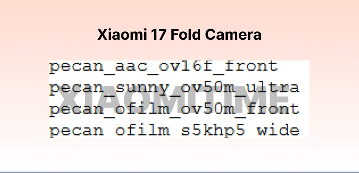 Według XiaomiTimekod HyperOS zawiera odniesienia do sprzętu fotograficznego dla "pecan", rzekomej nazwy kodowej dla Xiaomi 17 Fold. Jak pokazuje poniższy obrazek, pecan zawiera S5KHP5 jako szeroki lub główny aparat. Skrót od Samsung ISOCELL HP5, S5KHP5 ma natywną moc wyjściową 200 MP i ma być używany w urządzeniach takich jak Find X9 Pro jako teleobiektyw.