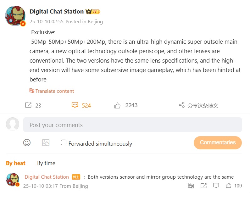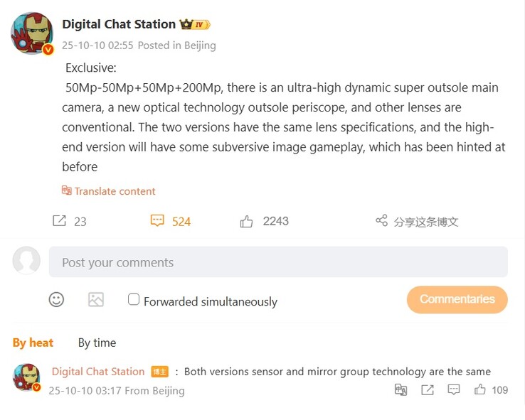 Istnieją również inne spekulacje na Weibo, które zostały podsumowane przez użytkownika X @Devinarde (patrz poniżej). Oprócz około 3-7-krotnego zoomu optycznego, niektórzy użytkownicy Weibo spekulują również na temat zespołu czujników składającego się z 1/1. 4-calowy 200 MP ISOCELL HPE i 1/1.276-calowy ISOCELL JN5, które najwyraźniej tworzą rodzaj podwójnego teleobiektywu z optyką, która może działać podobnie do Huawei Pura 80 Ultra z ruchomym suwakiem, tylko w odwrotnej kolejności.