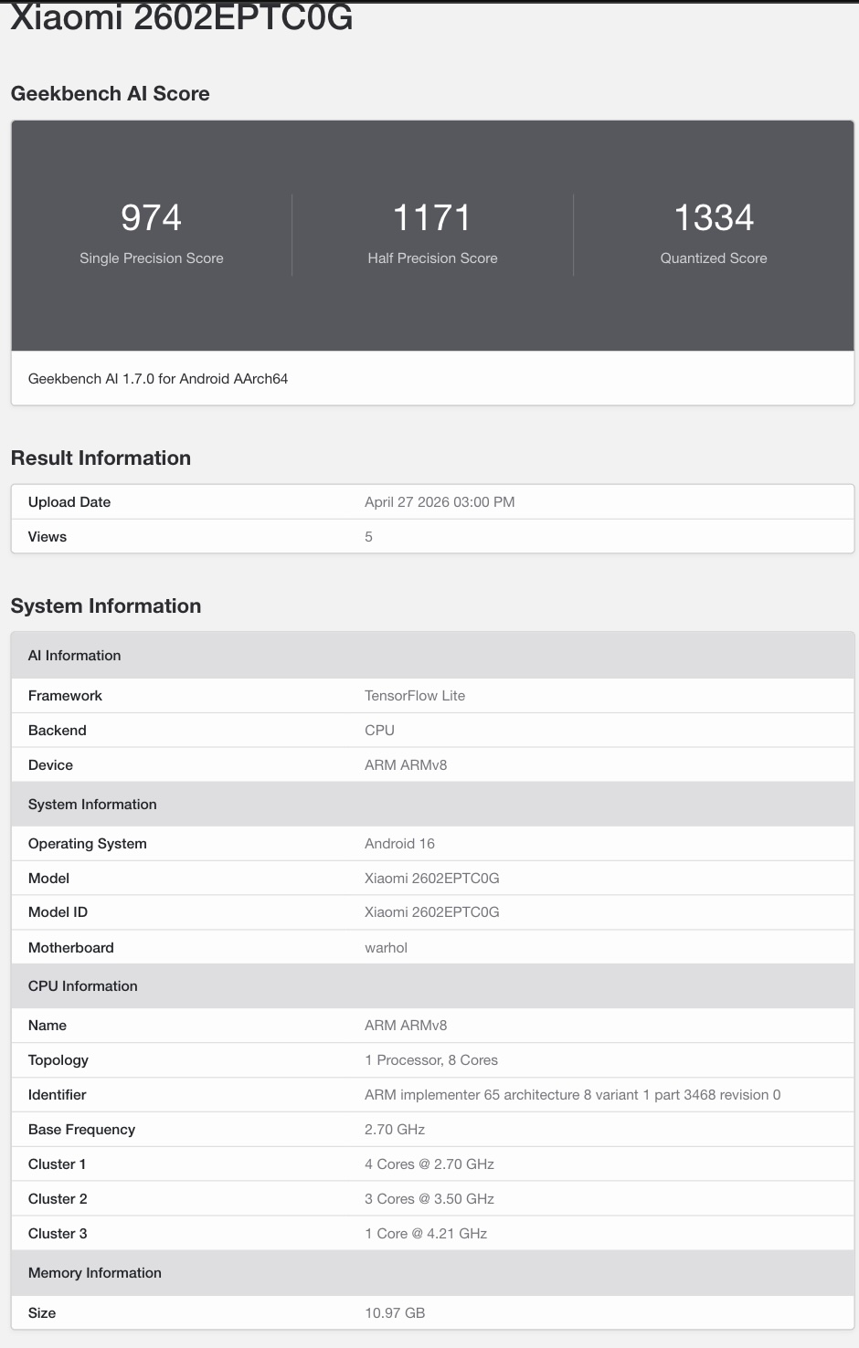 Według benchmarku, Xiaomi 17T Pro będzie zasilany przez Dimensity 9500 wraz z 12 GB pamięci RAM. Dla porównania, Dimensity 9500 to flagowy chipset MediaTek oparty na procesie 3 nm i zasila urządzenia takie jak Vivo X300 Pro i Oppo Find X9 Pro. W teście Geekbench AI, Xiaomi 17T Pro uzyskał 974 punkty w teście pojedynczej precyzji, 1171 punktów w teście połowy precyzji i 1334 punkty w teście kwantyzacji.