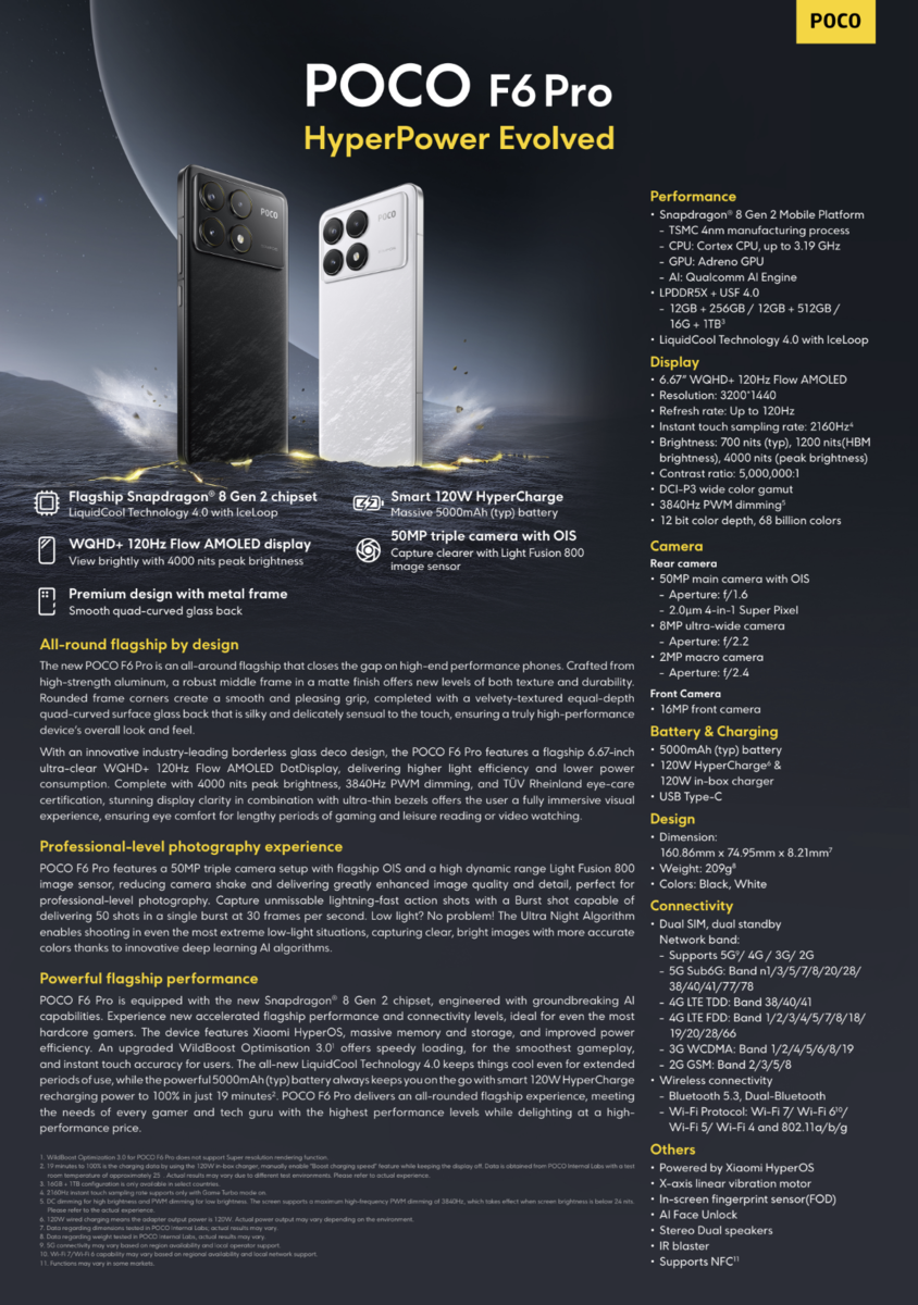 Jak pokazuje poniższa grafika, POCO F6 Pro zasila swój flagowy chipset ostatniej generacji baterią o pojemności 5000 mAh, którą ładuje z mocą 120 W dzięki rozwiązaniu HyperCharge firmy Xiaomi. Co więcej, POCO F6 Pro wyposażony jest w 6,67-calowy wyświetlacz o rozdzielczości 3220 x 1440 pikseli, 120 Hz i jasności szczytowej 4000 nitów (1200 nitów HBM). Co więcej, POCO F6 Pro zawiera następujące kamery w obudowie o wymiarach 160,86 x 74,95 x 8,21 mm i wadze 209 g: