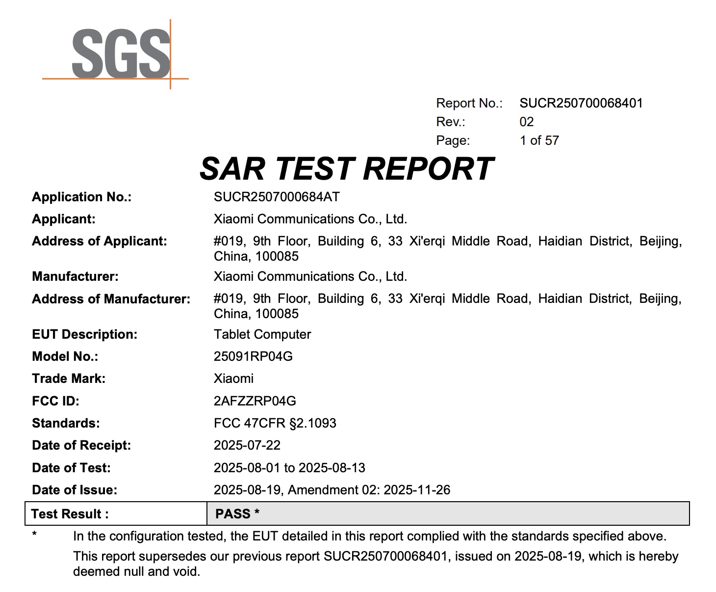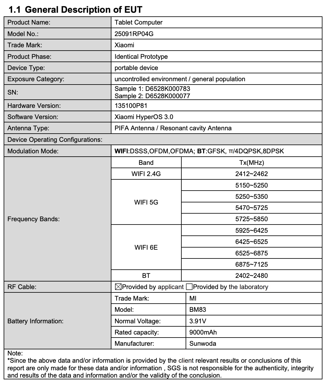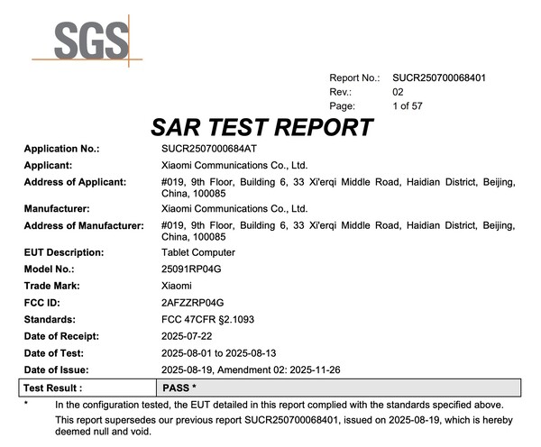 Tablet otrzymał certyfikat z numerem modelu "25091RP04G" Dla porównania, chiński model Xiaomi Pad 8 Pro używa niemal identycznego numeru modelu, "25091RP04C", przy czym "C" oznacza model chiński, a "G" wersję globalną.