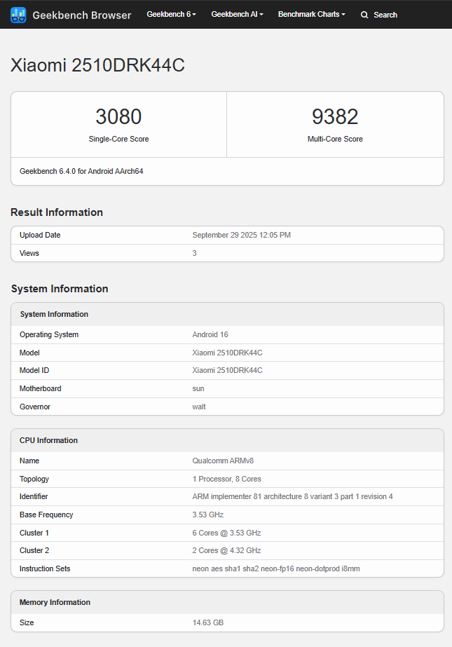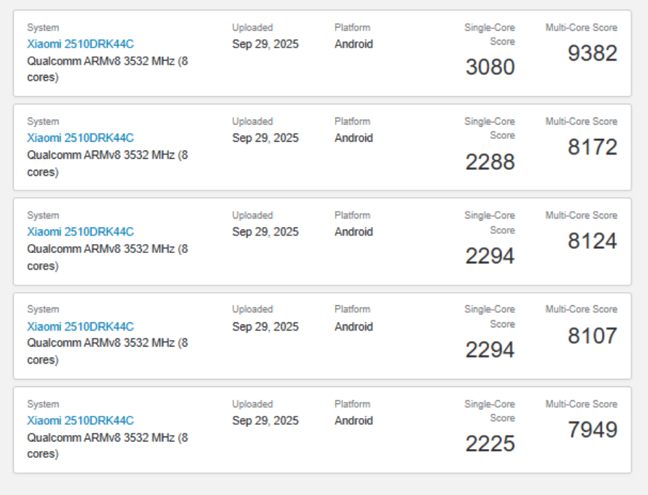 W rzeczywistości wskazują one, że Xiaomi zdecydowało się na ten sam chipset, którego używało w zeszłym roku wewnątrz Redmi K80 Pro. W szczególności wszystkie listy Geekbench łączą Xiaomi 2510DRK44C z Snapdragon 8 Elite i jego chipsetem Adreno 830 GPU. Krótko mówiąc, średnie 2,436 i 8,346 w jednordzeniowych i wielordzeniowych testach porównawczych Geekbench 6 są niższe od mediany Snapdragon 8 Elite które do tej pory testowaliśmy.