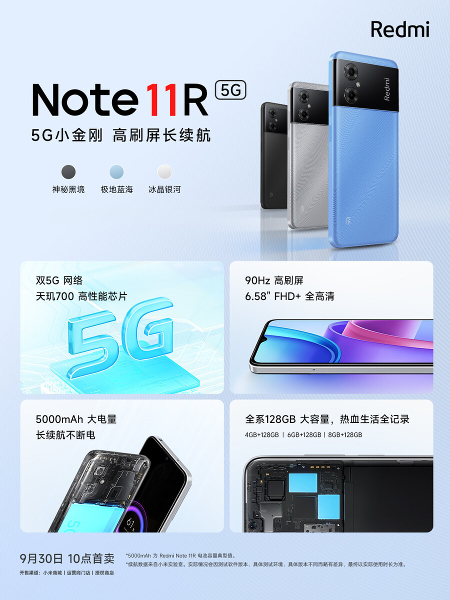 Sercem Redmi Note 11R jest 6,58-calowy wyświetlacz pracujący z częstotliwością 90 Hz, 1080p i kontrastem 1,500:1. Dodatkowo urządzenie posiada baterię o pojemności 5000 mAh, 128 GB pamięci masowej oraz 4 GB, 6 GB lub 8 GB pamięci RAM. Co więcej, Redmi Note 11R występuje w trzech kolorach, wszystkie z designem przypominającym m.in POCO M4 5G.
