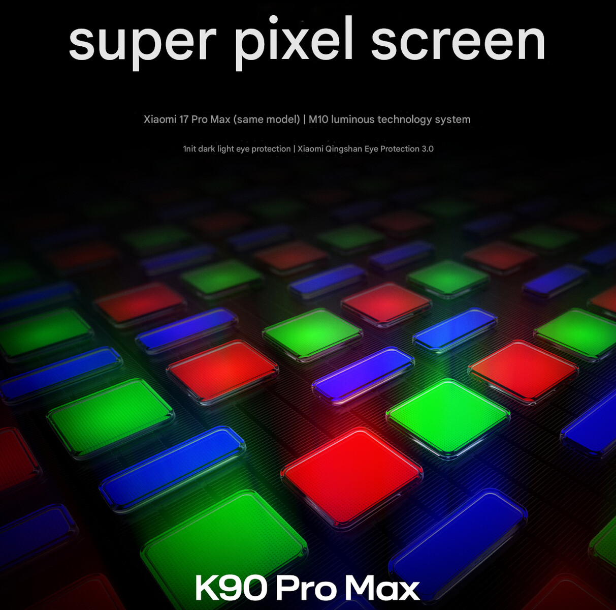 Firma twierdzi również, że K90 Pro Max ma 6,9-calowy wyświetlacz, który zapewnia takie same wrażenia jak ekran Xiaomi 17 Pro Max(dostępny na TradingShenzhen). Dzięki "Qingshan Eye Protection 3.0", obsłudze jasności 1 nit i pełnemu przyciemnianiu DC, panel ma zapewnić wygodne oglądanie w trudnych warunkach.