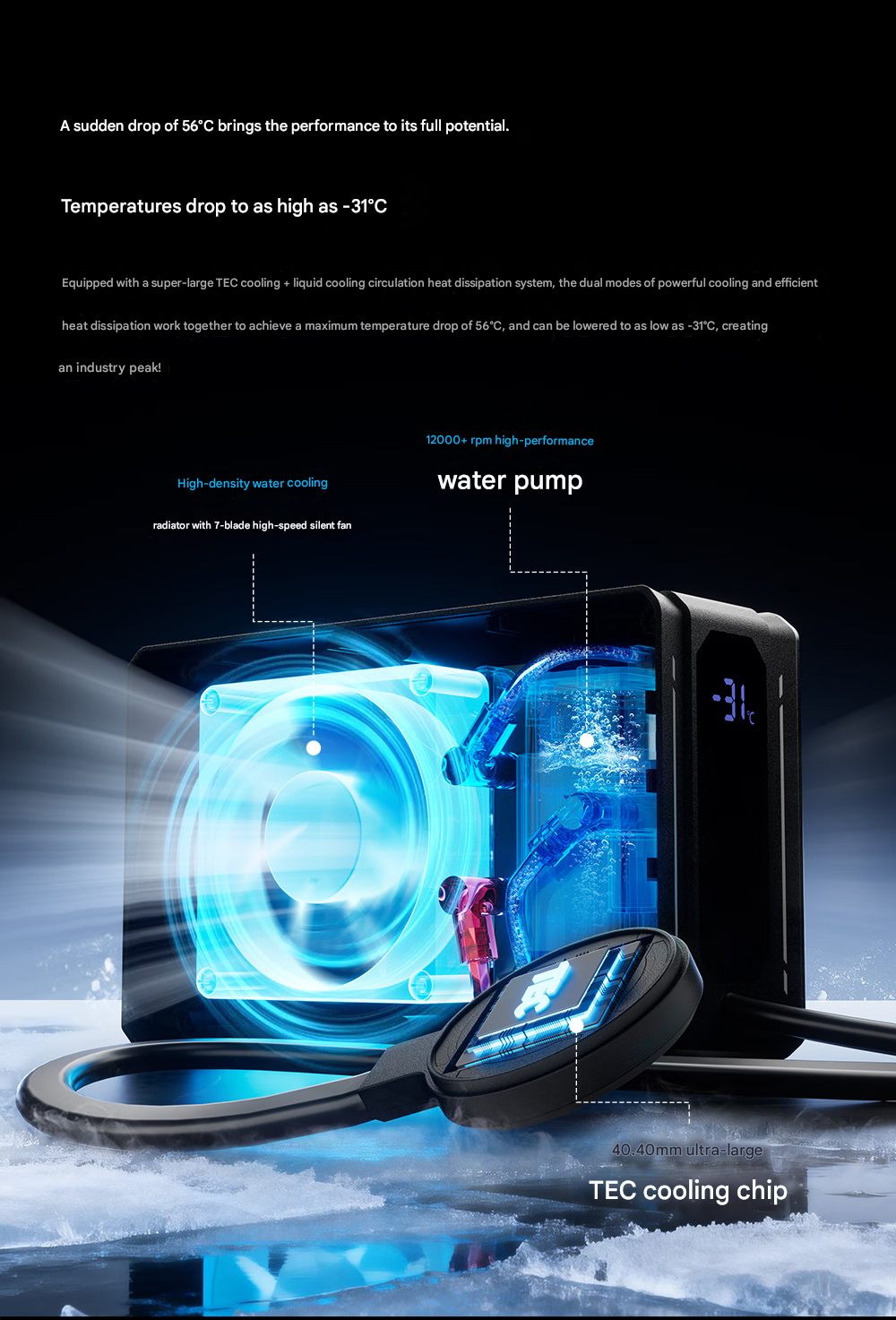 Jest ona sparowana z chłodnicą o powierzchni 1,65,900 mm² i 7-łopatkowym wentylatorem "high-speed". Xiaomi twierdzi, że taka konfiguracja może obniżyć temperaturę roboczą o 56 ° C, umożliwiając podłączonym urządzeniom utrzymanie -31 ° C podczas dużych obciążeń.