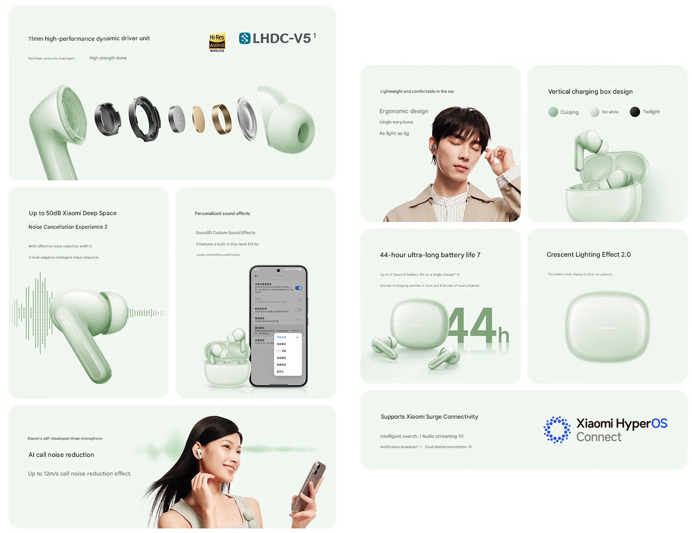 Dostępna jest funkcja personalizacji dźwięku, umożliwiająca użytkownikom utworzenie niestandardowy SoundID który pasuje do ich preferencji słuchowych. Xiaomi obiecuje również wyraźne wrażenia z rozmów dzięki konfiguracji trzech mikrofonów, która jest sparowana z algorytmem redukcji szumów AI.