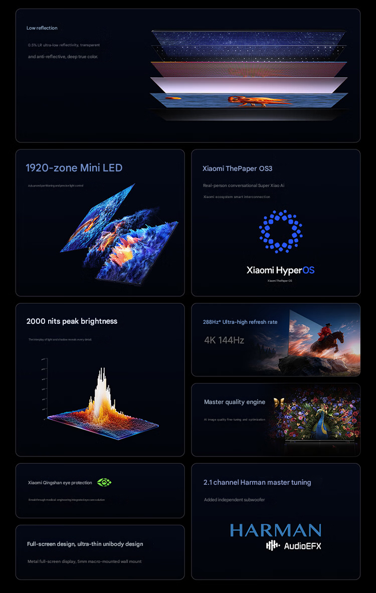 Monitor najnowsza linia EUma maksymalną przekątną 98 cali, szczytową jasność 1200 nitów i do 880 stref przyciemniania. Poza tym, Xiaomi podkreśla właściwości niskorefleksyjne chińskiej serii S Mini LED TV 2026. Jest to "0,5% folia o niskim współczynniku odbicia", która powinna zapewnić lepsze wrażenia wizualne w trudnych warunkach oświetleniowych.