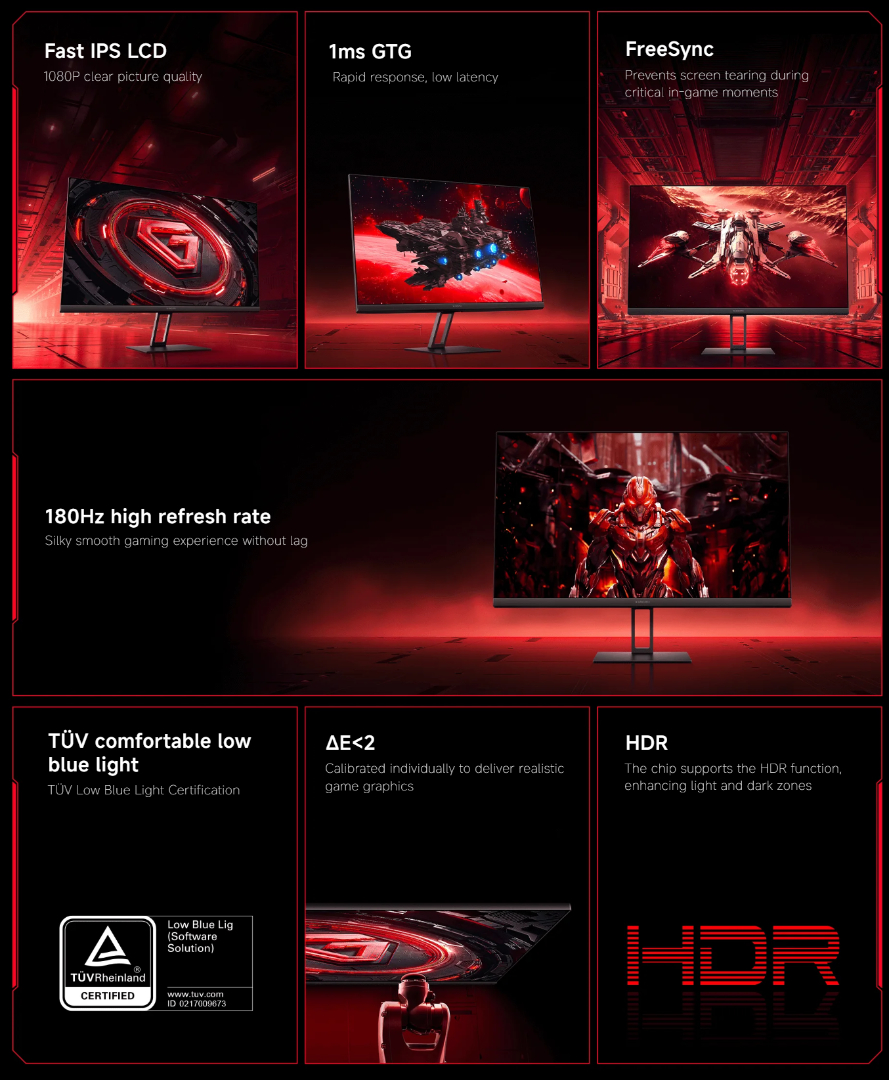 Co więcej, monitor może pochwalić się jasnością szczytową na poziomie 250 nitów, kontrastem 1000:1 i 99% pokryciem przestrzeni barw sRGB. Co więcej, Gaming Monitor G24i charakteryzuje się częstotliwością odświeżania 180 Hz, czasem reakcji 1 ms GtG i obsługą AMD FreeSync. Tymczasem wyjścia wideo są obsługiwane przez pojedyncze porty DisplayPort i HDMI.