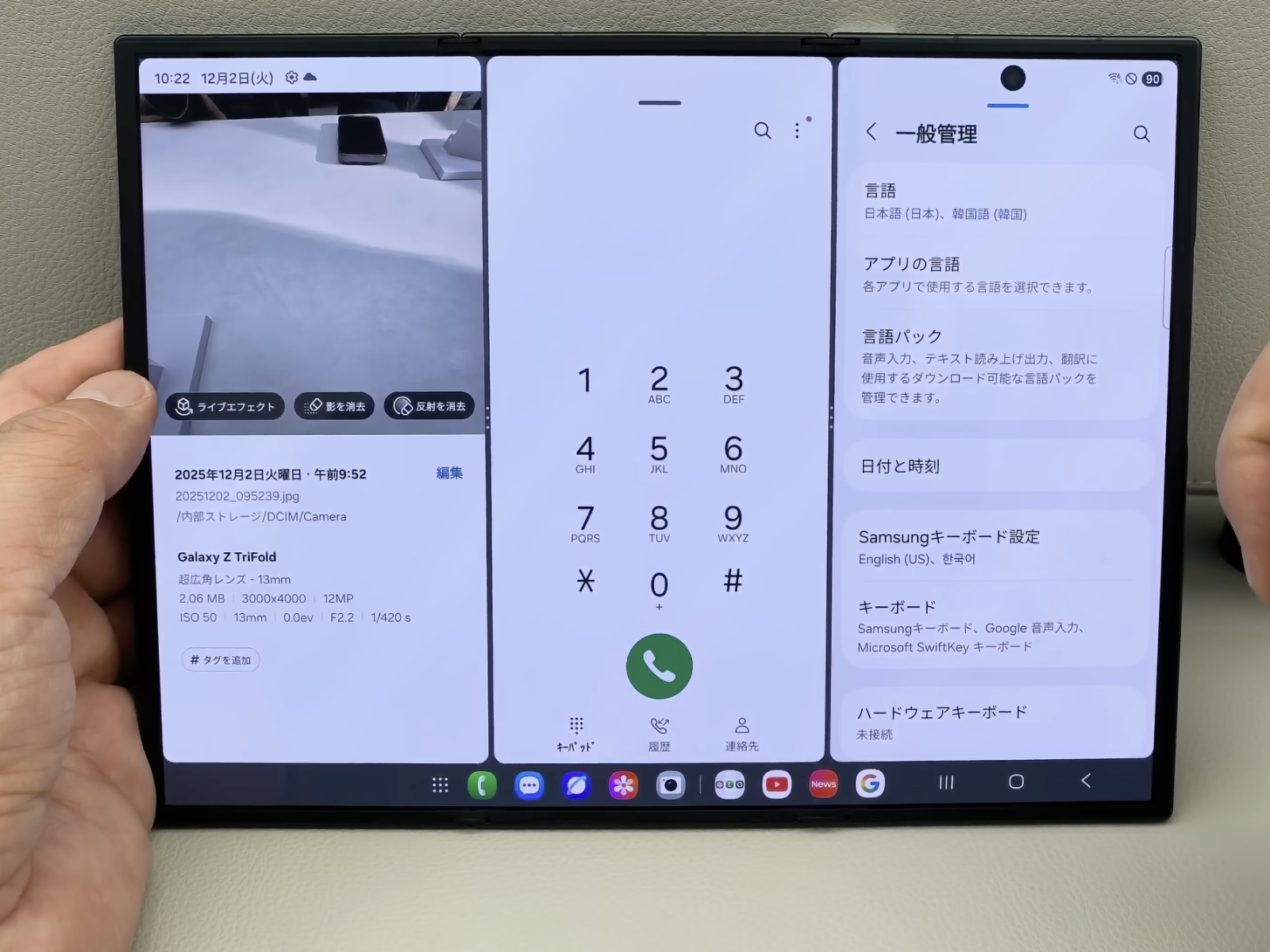 Najwyraźniej Galaxy Z TriFold jest stosunkowo lekki po rozłożeniu, pomimo swojej wagi 309 g. Podobnie, grubość 3,9 mm sprawia, że urządzenie jest znacznie cieńsze niż tablety o równoważnych rozmiarach. Pomijając okropny autodubbing, wideo podkreśla niektóre funkcje wielozadaniowości specyficzne dla Galaxy Z TriFold.