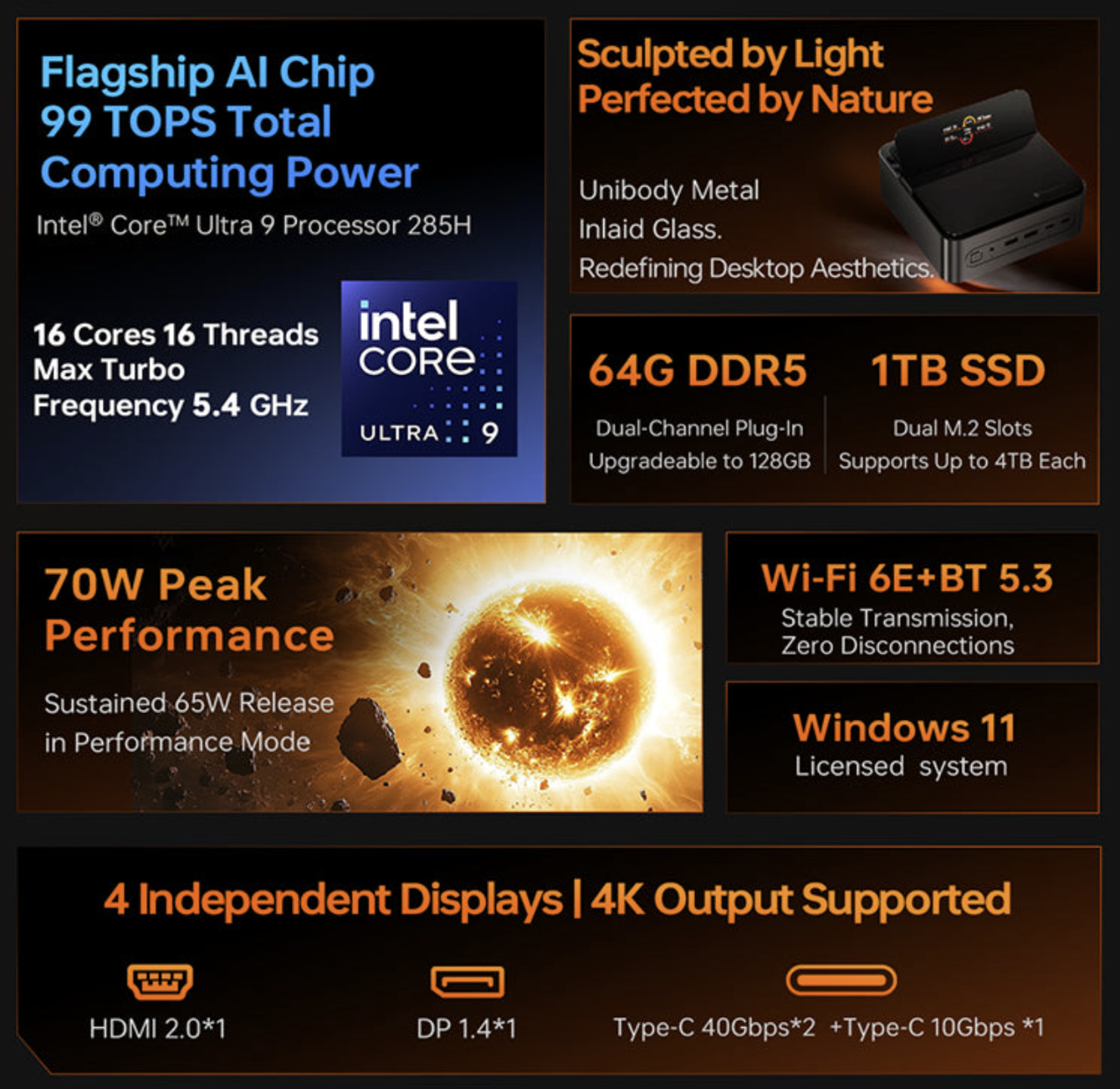W rezultacie mini-PC pojawił się na całym świecie w dość drogiej cenie 1 799 USD. Za tę cenę Machenike GTS jest wyposażony w Core Ultra 9 285H 64 GB pamięci RAM DDR5 i 1 TB pamięci masowej PCIe 4.0. Proszę zauważyć, że drugie gniazdo M.2 2280 jest pod ręką, aby w razie potrzeby dodać więcej pamięci masowej. Ponadto, dwa gniazda SO-DIMM mini-PC obsługują do 128 GB pamięci RAM DDR5-5600. Proszę zobaczyć Strona internetowa Minixpc aby uzyskać więcej informacji.