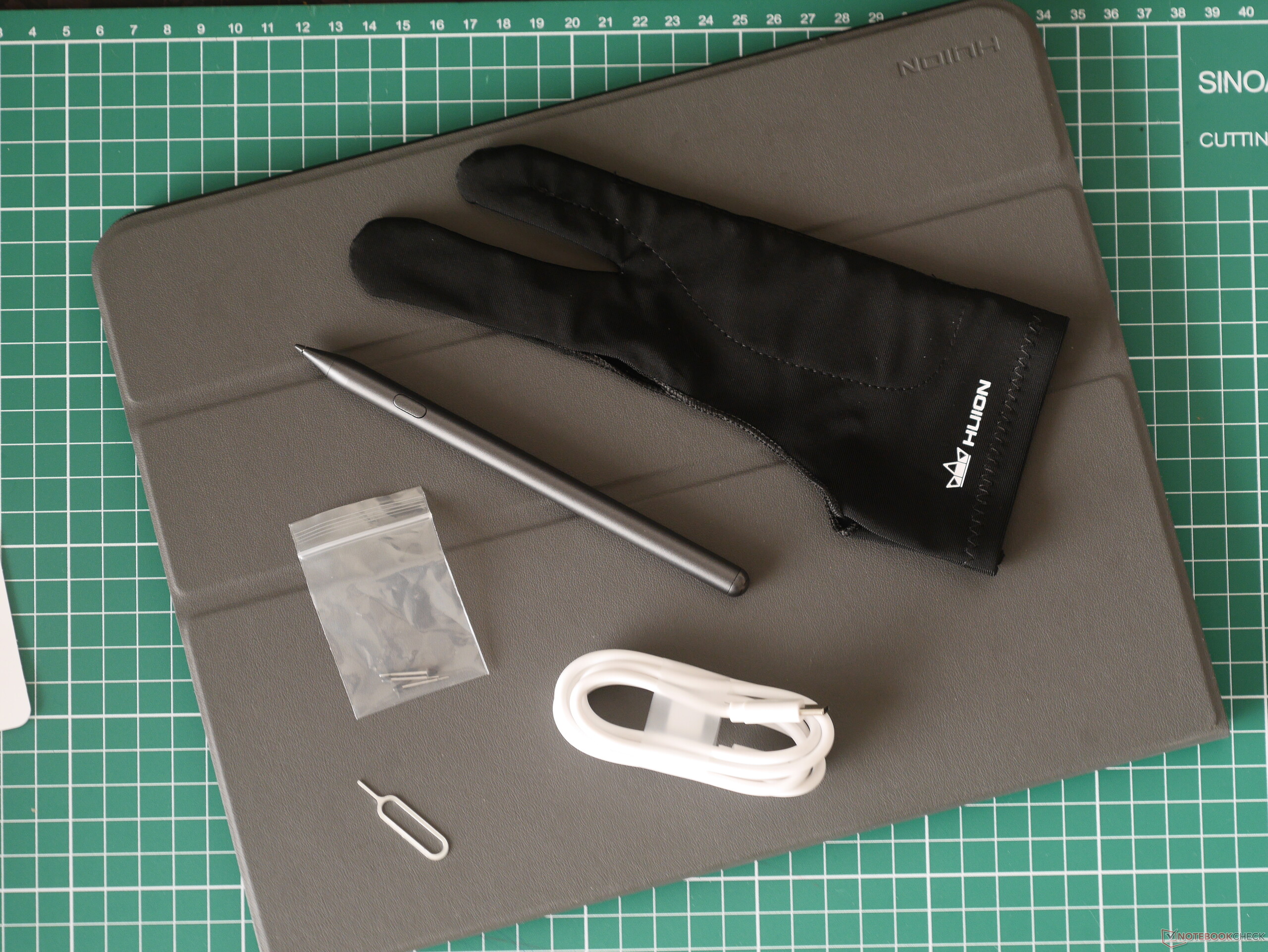 Z wyjątkiem braku dołączonej ładowarki, zestaw akcesoriów Huion Kamvas Slate 13 jest przyzwoity. Oburęczna rękawica do rysowania jest na tyle rozciągliwa, że pasuje do różnych rozmiarów dłoni i ogranicza przypadkowe dotknięcia.