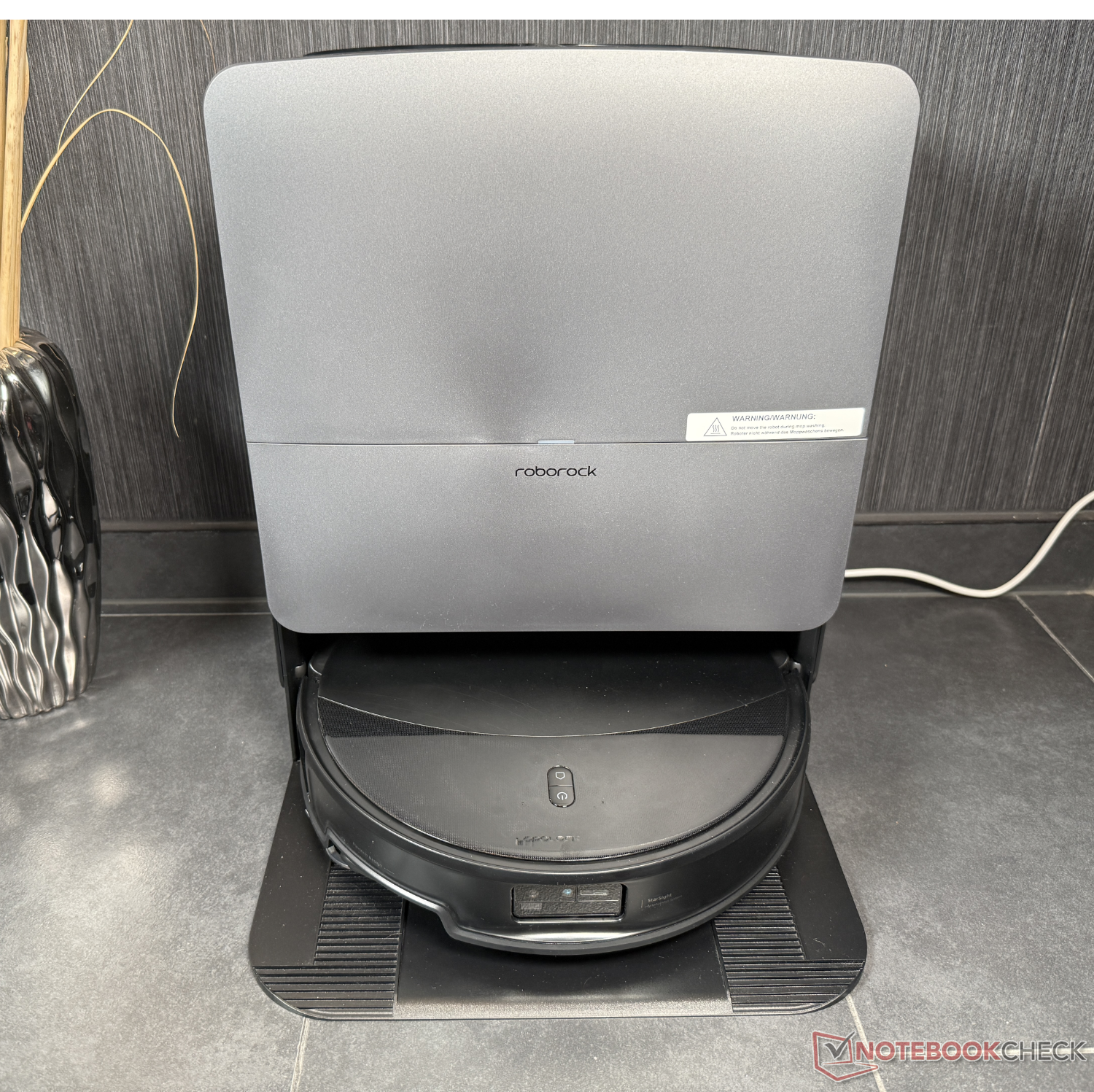 Przetestowaliśmy zestaw Saros 20. Ponieważ w zestawie nie ma środka czyszczącego, nie braliśmy go pod uwagę w naszych testach czyszczenia (pomimo opcji automatycznego dozowania w stacji). To prowadzi nas do RockDock, stacji czyszczącej Saros 20. Ma bardzo podobną konstrukcję do Saros 10R, ale teraz może czyścić mopy i siebie gorącą wodą o temperaturze 100 ° C. Po tym następuje suszenie ciepłym powietrzem o temperaturze 55°C. Oprócz zwykłego samoczynnego opróżniania pojemnika na kurz do worka na kurz (który jest teraz suszony świeżym powietrzem), istnieje również wspomniane dozowanie detergentu i ładowanie w ciągu 2,5 godziny.