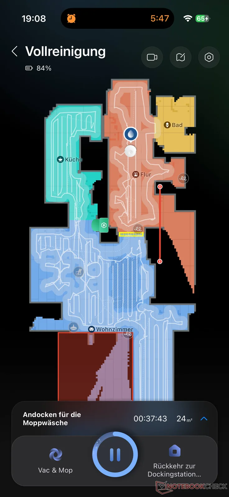 Po bezproblemowej konfiguracji, podczas której użytkownik jest brany za rękę, rozpoczyna się zwykłe mapowanie. Automatyczne rozpoznawanie pomieszczeń w większości przypadków działało dobrze. Ręczne przeróbki, takie jak indywidualne nazwy pomieszczeń lub strefy o ograniczonym dostępie, zostały szybko zakończone. Robot odkurzający i mopujący był gotowy do użycia po dobrych 10 minutach.