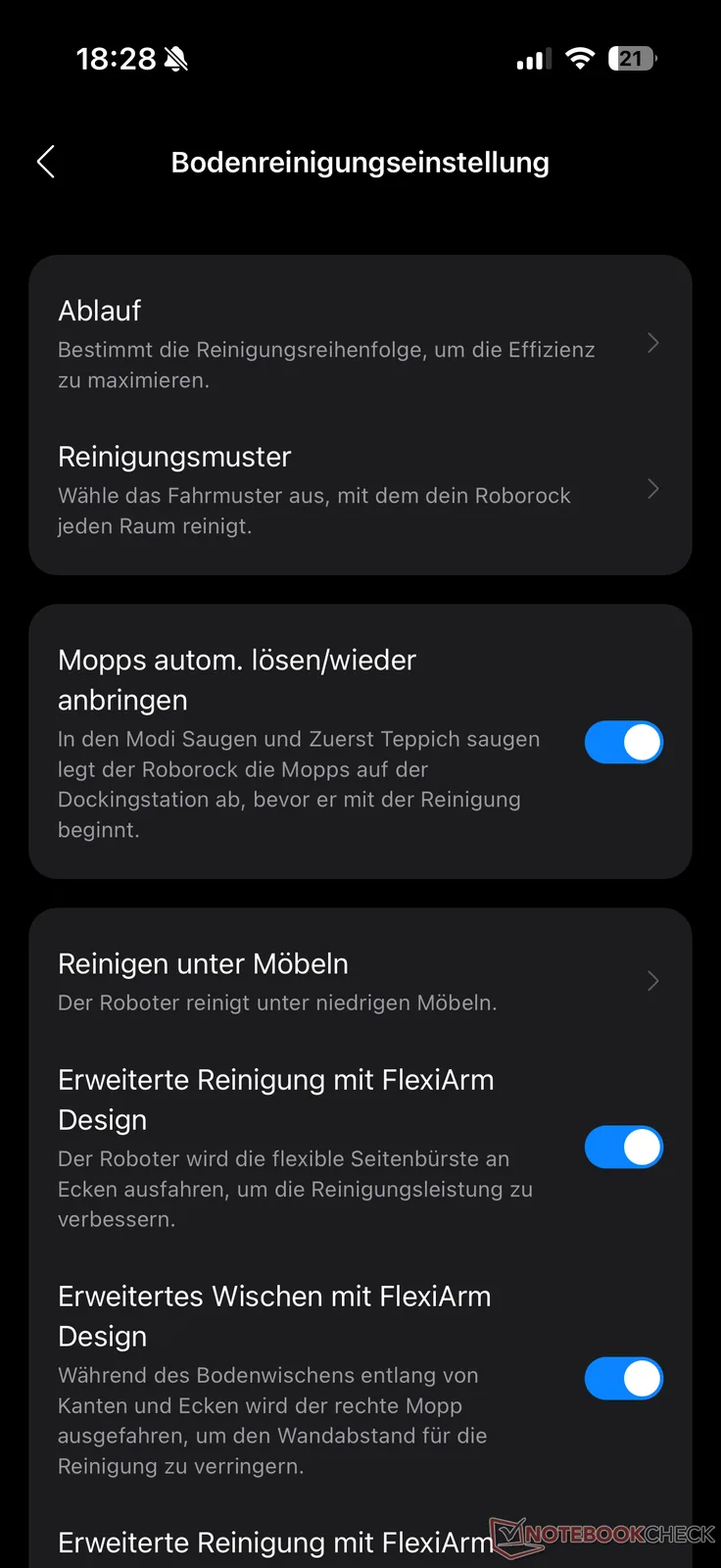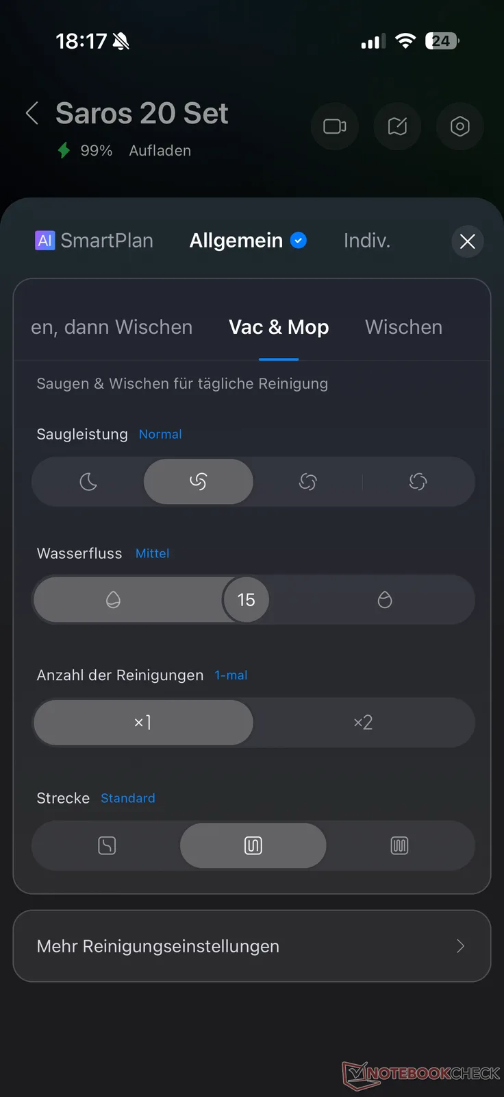 Aplikacja Roborock oferuje cztery opcje czyszczenia dla Saros 20: "Odkurzanie i mopowanie", "Najpierw odkurzanie, potem mopowanie" oraz "Tylko odkurzanie" i "Tylko mopowanie". Dla obu trybów czyszczenia dostępne są różne opcje. Na przykład moc ssania można regulować w standardowych czterech stopniach, a wilgotność mopa w 30 stopniach. AI SmartPlan jest również dostępny jako alternatywa dla trybów. Tutaj robot coraz lepiej dostosowuje się do warunków, kontrolowany przez sztuczną inteligencję.
