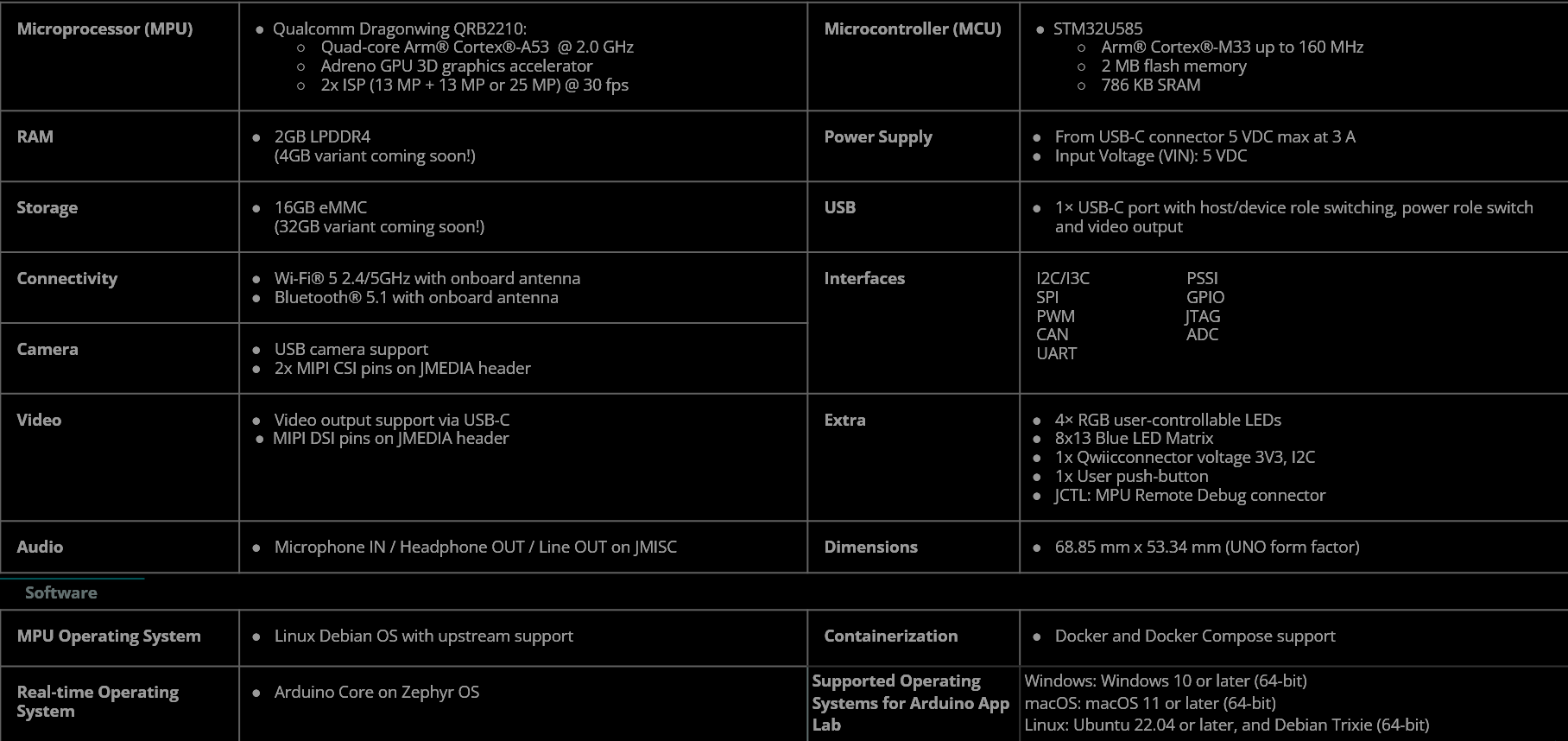 Początkowo Arduino UNO Q zostanie wprowadzony na rynek z 2 GB pamięci RAM i 32 GB pamięci eMMC. Wariant z 4 GB pamięci RAM i 64 GB pamięci ma pojawić się wkrótce. Domyślnie port USB-C może służyć jako wejście kamery i wyjście wideo, ale można również użyć dedykowanych pinów, aby zwolnić port. Z drugiej strony, mikrofony zawsze będą musiały korzystać z pinów.
